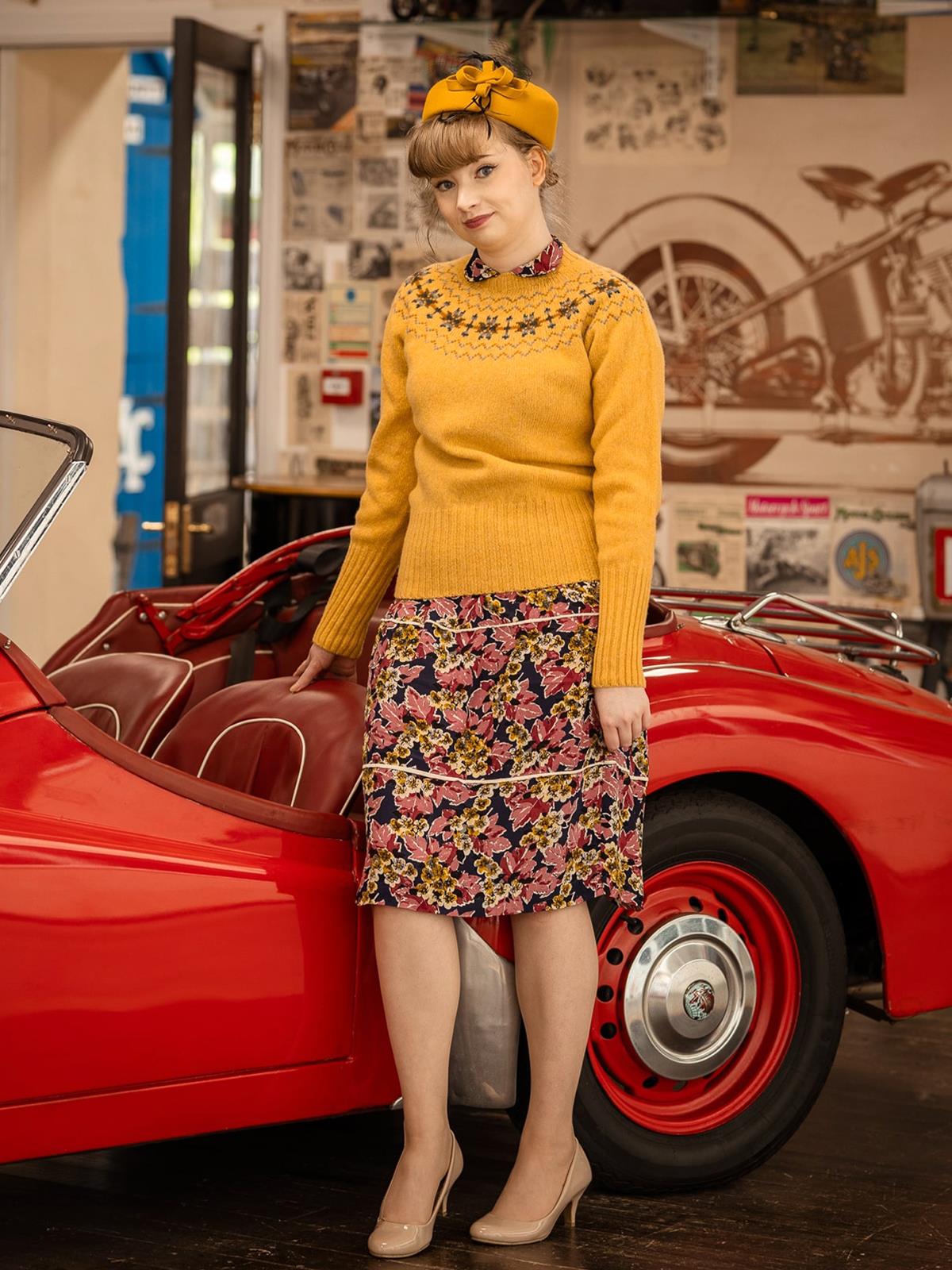 This pure Scottish wool knit jumper is a high-quality, lightly flecked butter yellow shade, with grey-blue and brown highlights in its Fairisle pattern. The deep welts give it an accurate 1940s or 1950s vintage look, with a high quality finish throughout.