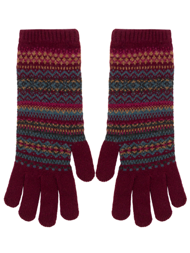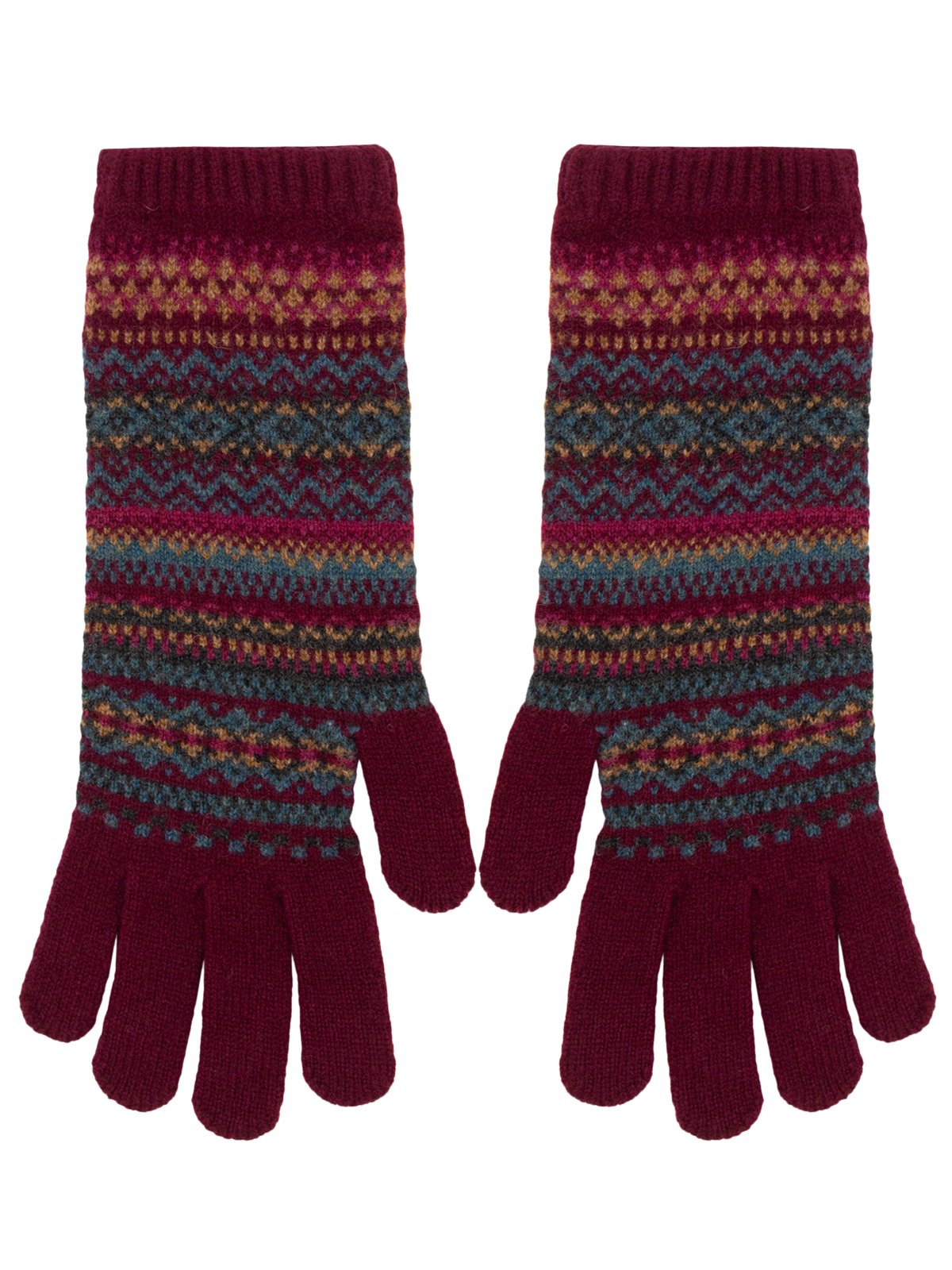 These high quality pure wool gloves are handmade in Scotland by Eribé, and feature a range of lime green, yellow and sky blue in its knit, on a deep purple background.