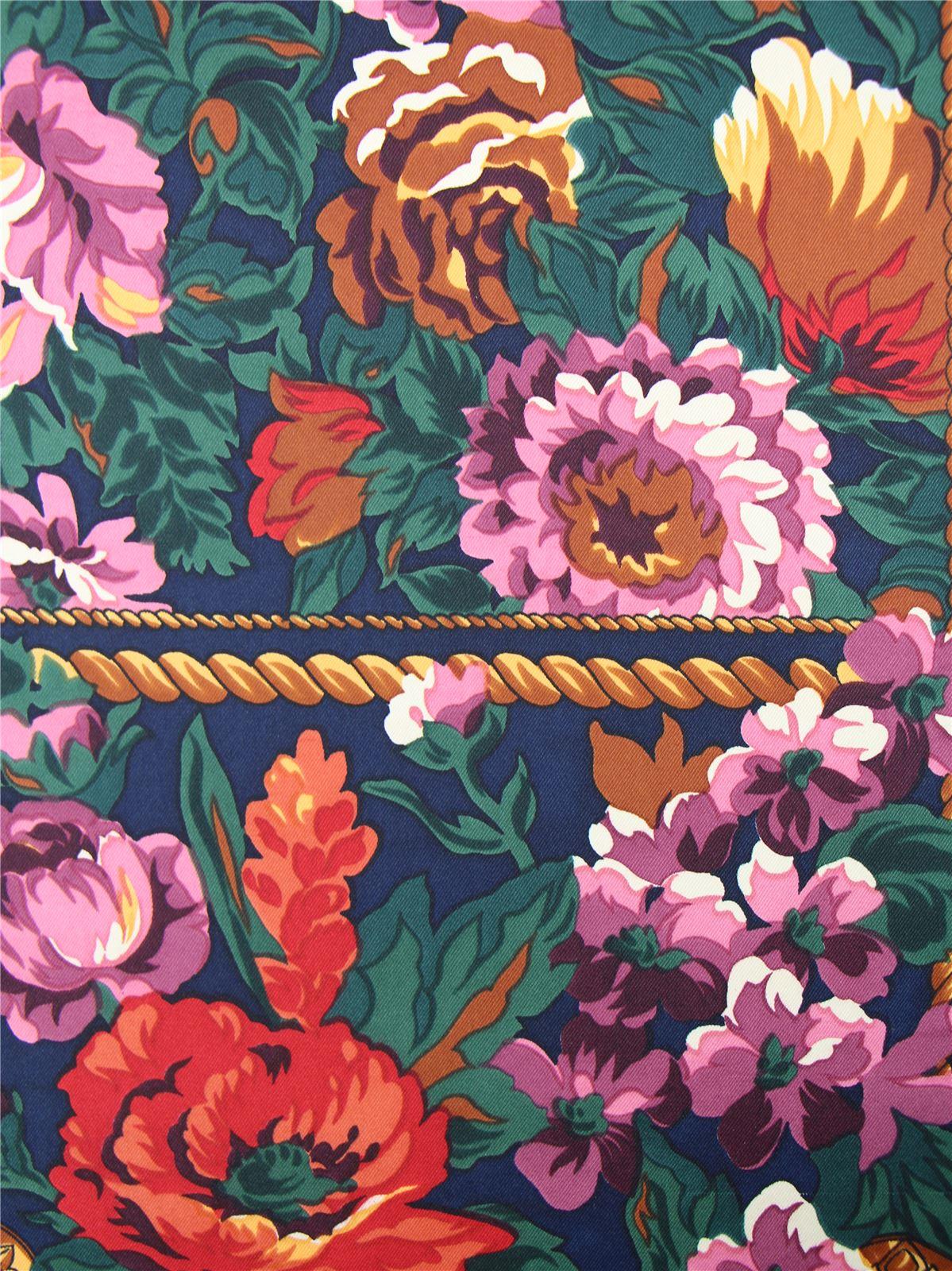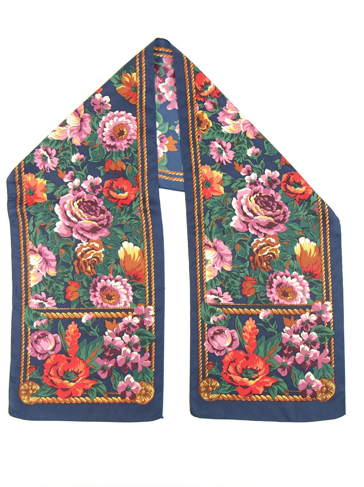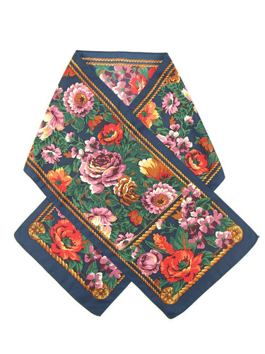 Oblong dark blue vintage scarf with a floral and rope edged pattern.