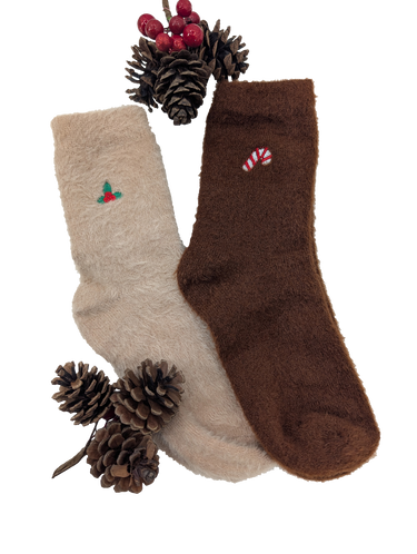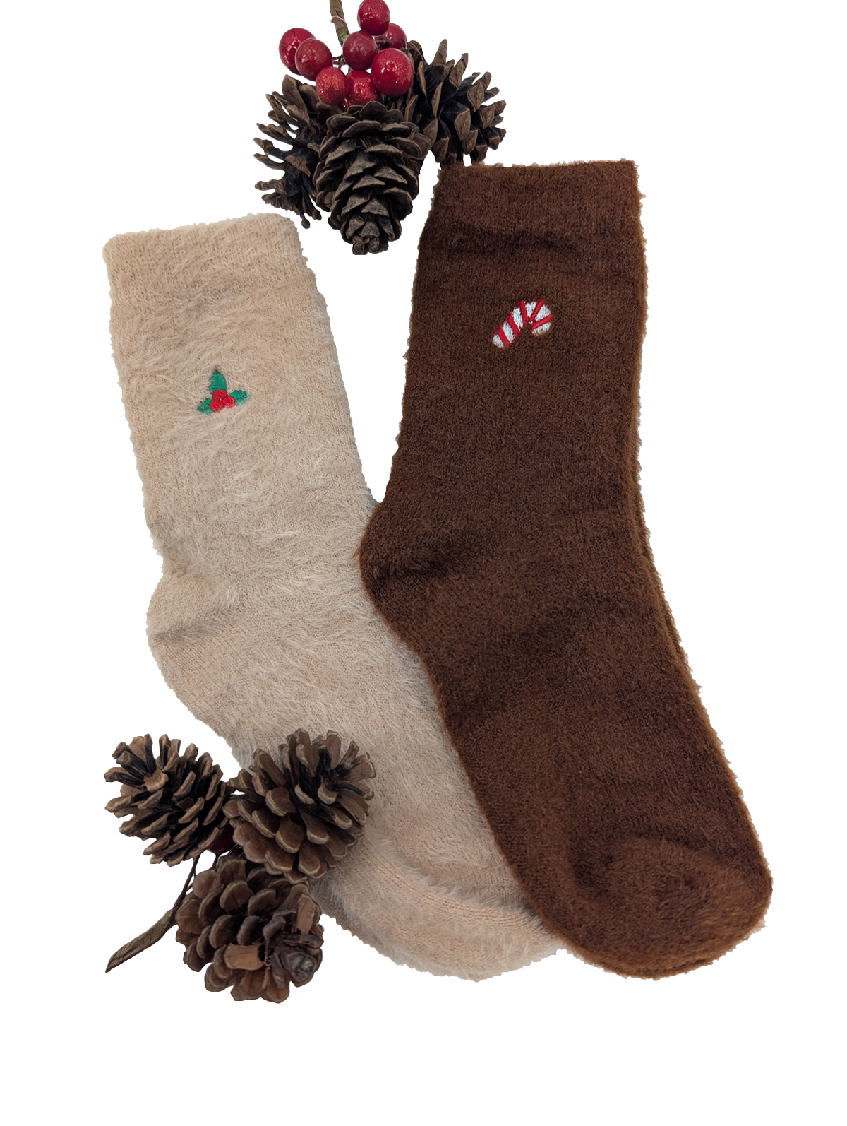 The set includes two plush, fluffy pairs: one in cream featuring a charming holly motif, and the other in dark brown featuring a festive candy cane motif.