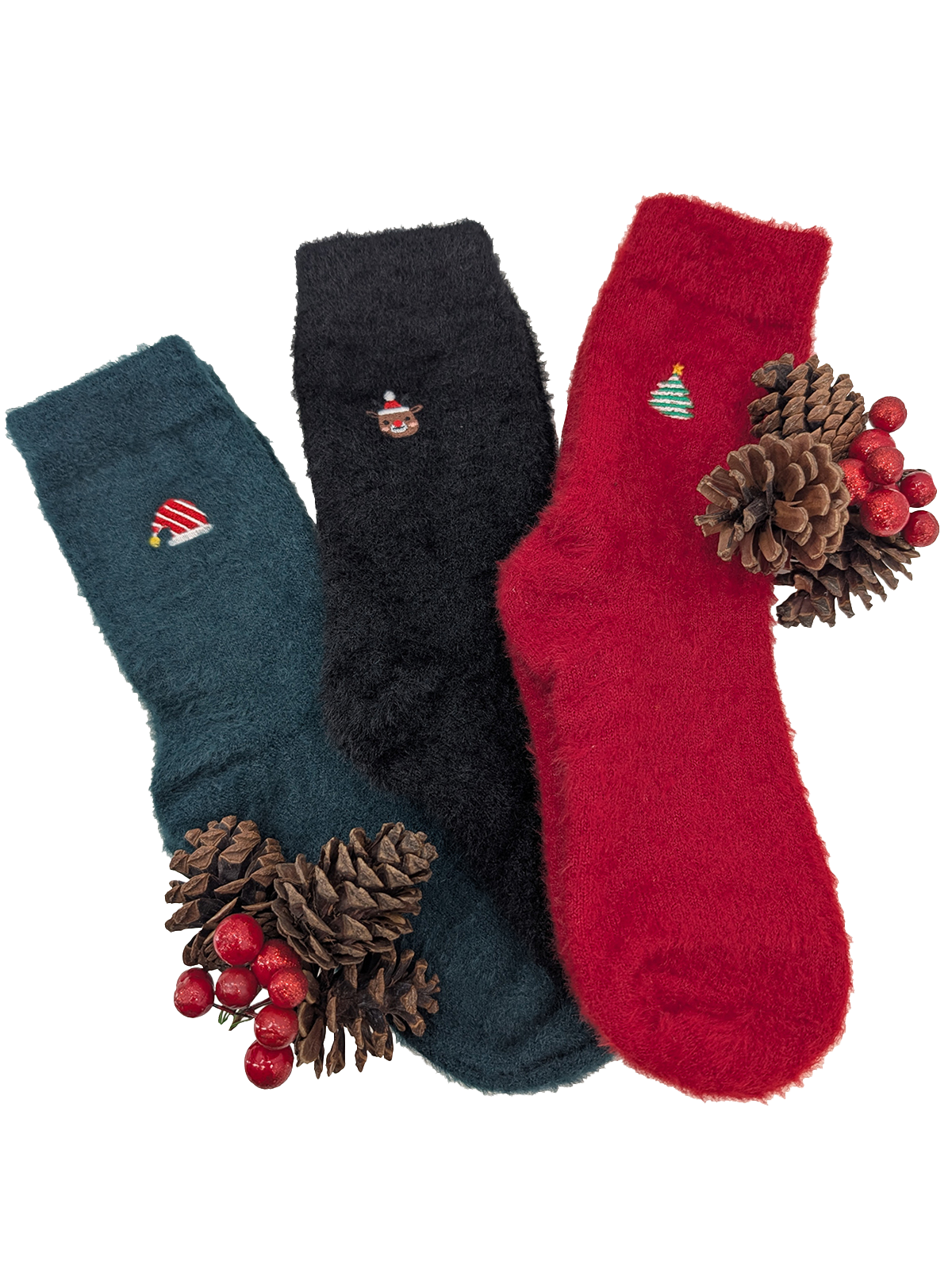 The set includes three plush, fluffy pairs, each featuring a different holiday motif: a Santa hat on a teal sock, a Santa face on a black sock, and a Christmas tree on a vibrant red sock.