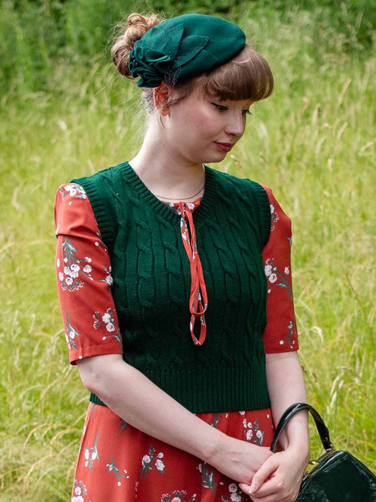 Forties look forest green sleeveless sweater with a V neckline. Lovely cable design front and back.