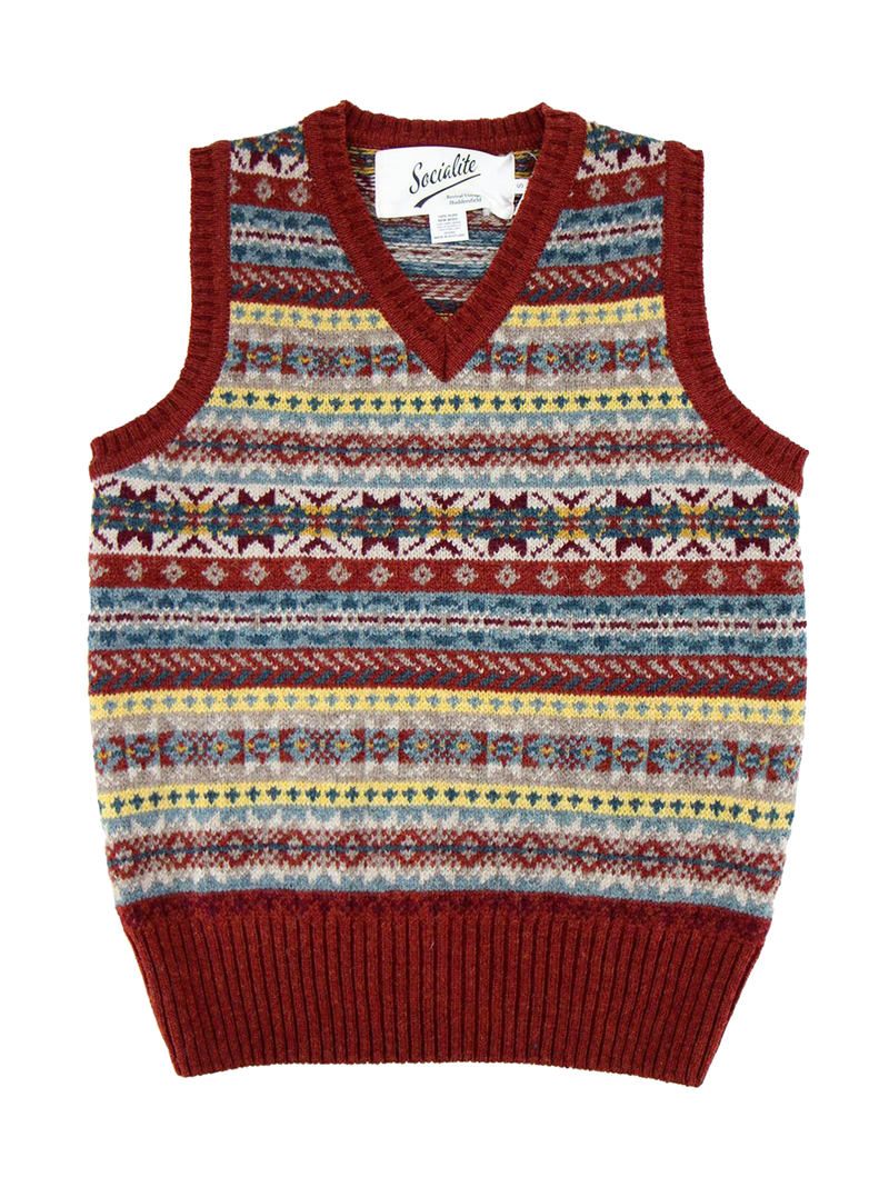This particular style is a sleeveless V-neck tank top or vest in a warm, deep red shade, with accents of blue, beige and yellow.