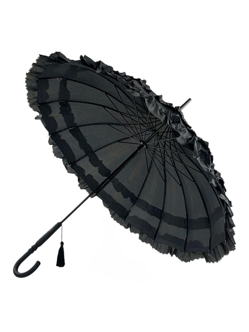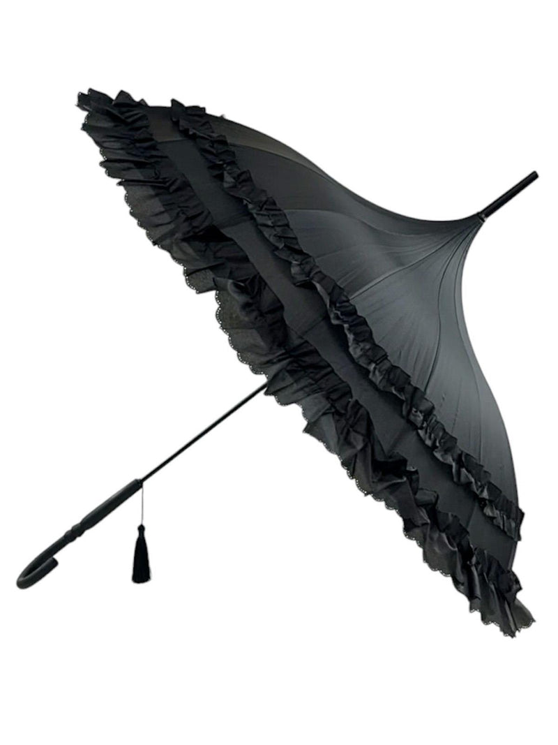 Charming retro look pagoda-shaped parasol umbrella with frilly detail, in classic black. Black crook handle.