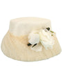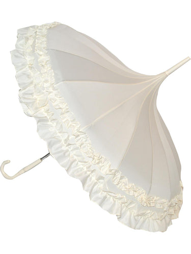 This pale beige retro look parasol or umbrella has layers of frills decorating the rim. Cream crook handle.