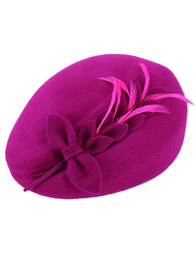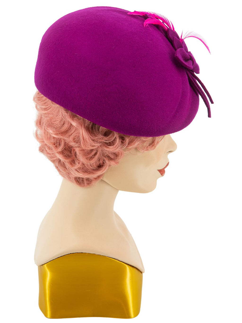 Add a bold touch of retro sophistication with this handmade vintage-inspired cloche hat, featuring a unique asymmetrical felt petal design and delicate decorative feathers. Crafted in a striking deep fuchsia pink shade from 100% wool with a water-resistant finish, this elegant piece can be worn straight or tilted for an extra dash of vintage flair.