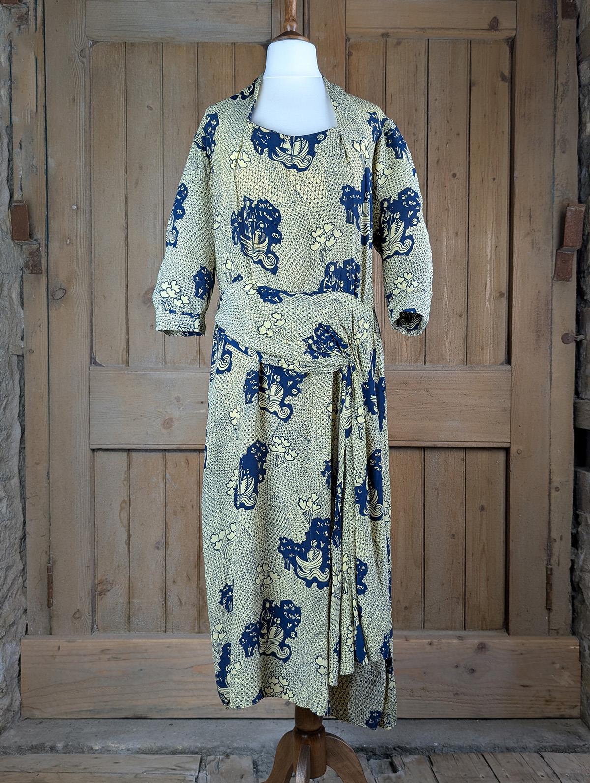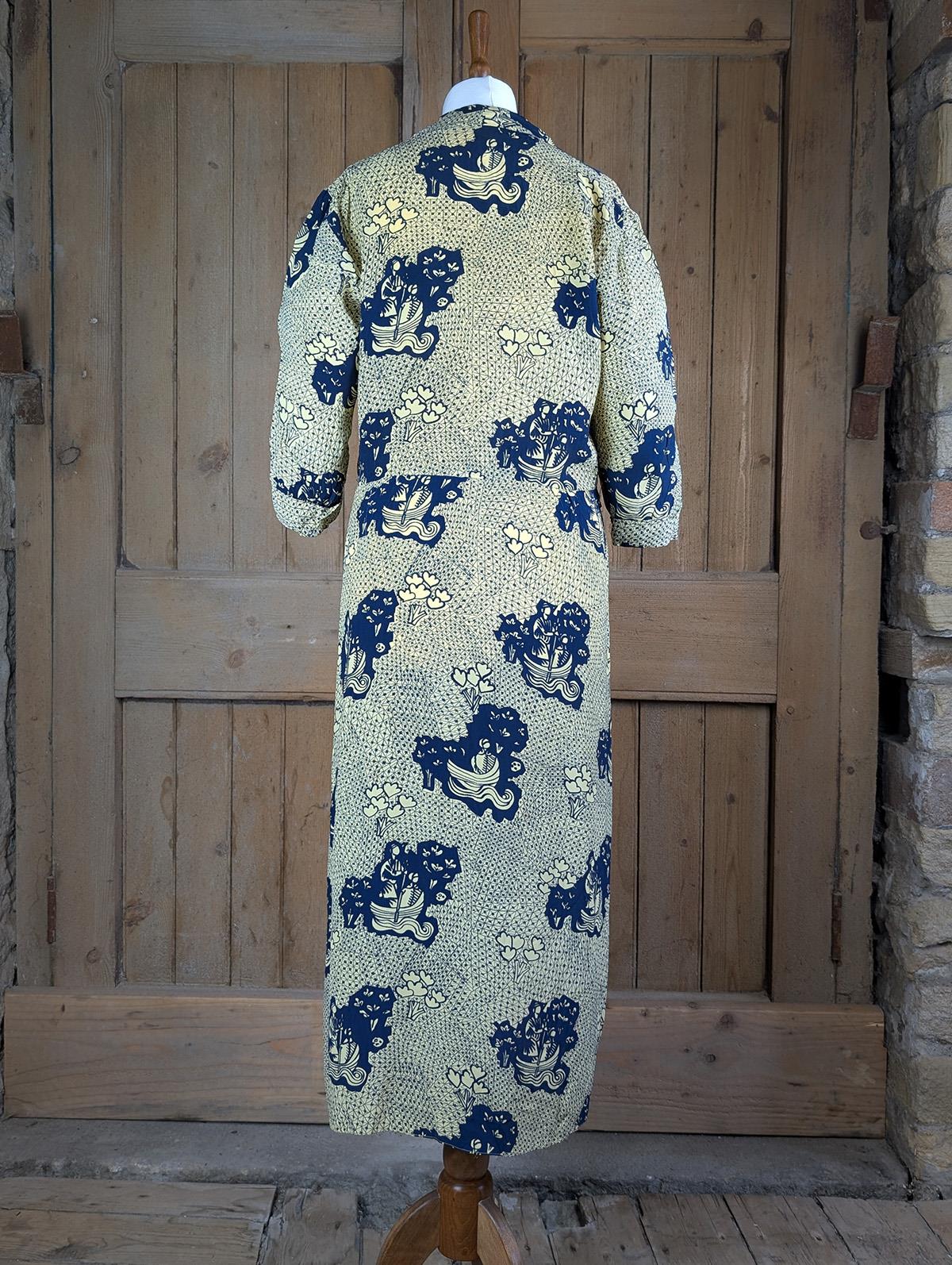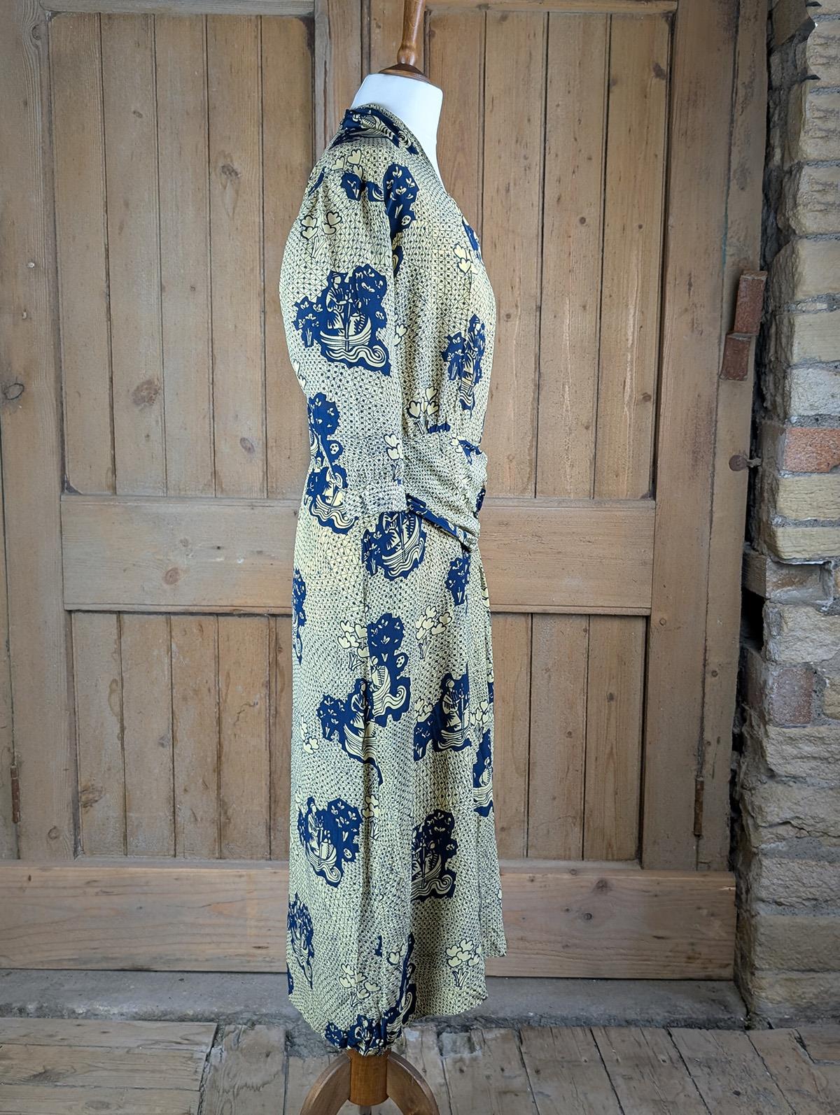 This original thirties, forties dress has a geometric grid base pattern with hearts and boats.