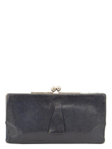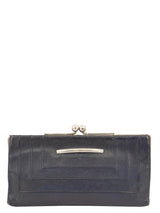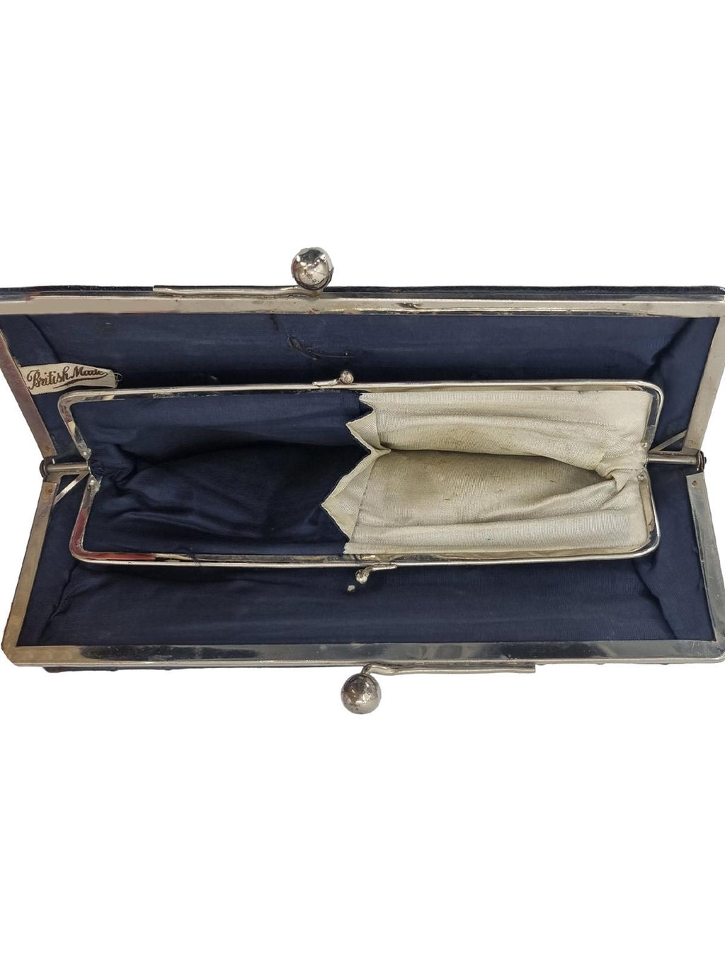 A vintage deep navy leather palm bag with geometric panel detail and a silver frame. It has a ball clasp closure and a navy fabric interior with two pockets and a mirror. Made in Britain, this timeless piece is in great condition with minor age-related wear. The stitching has come away slightly on the handle (see pictures). A classic accessory to complement formal midcentury style.