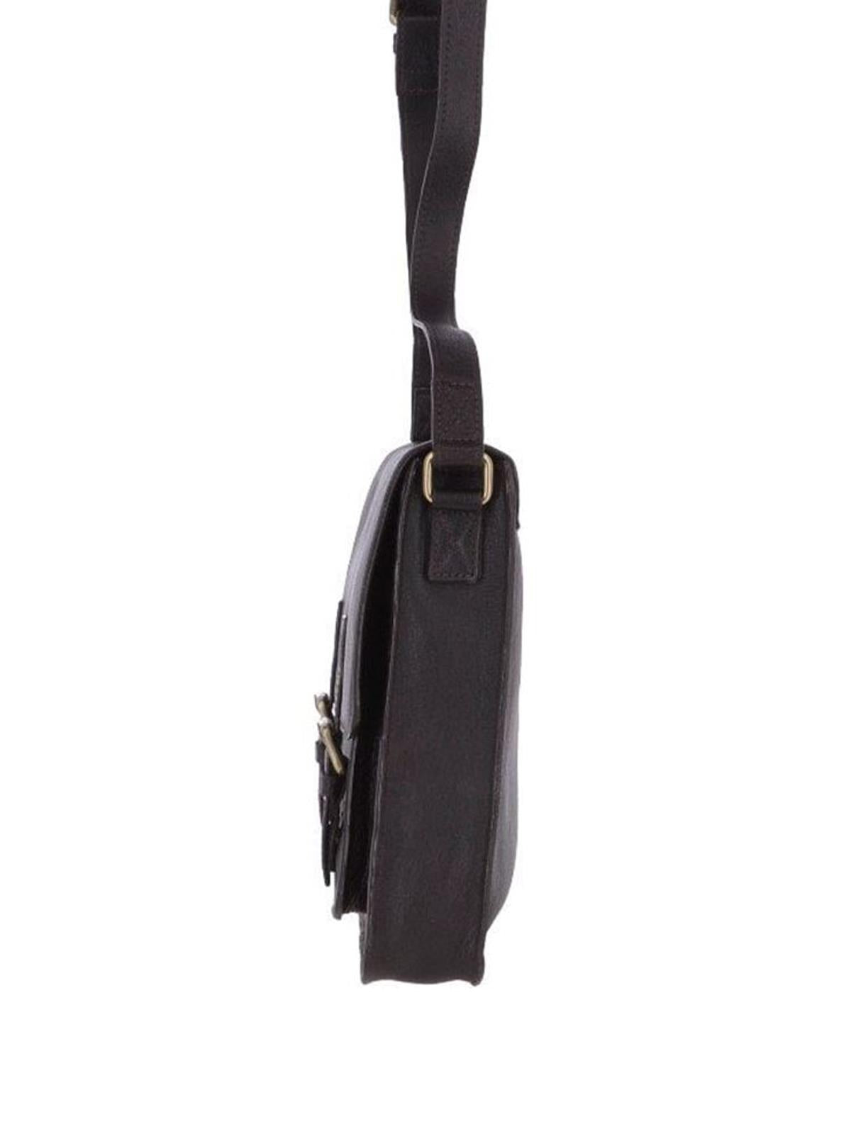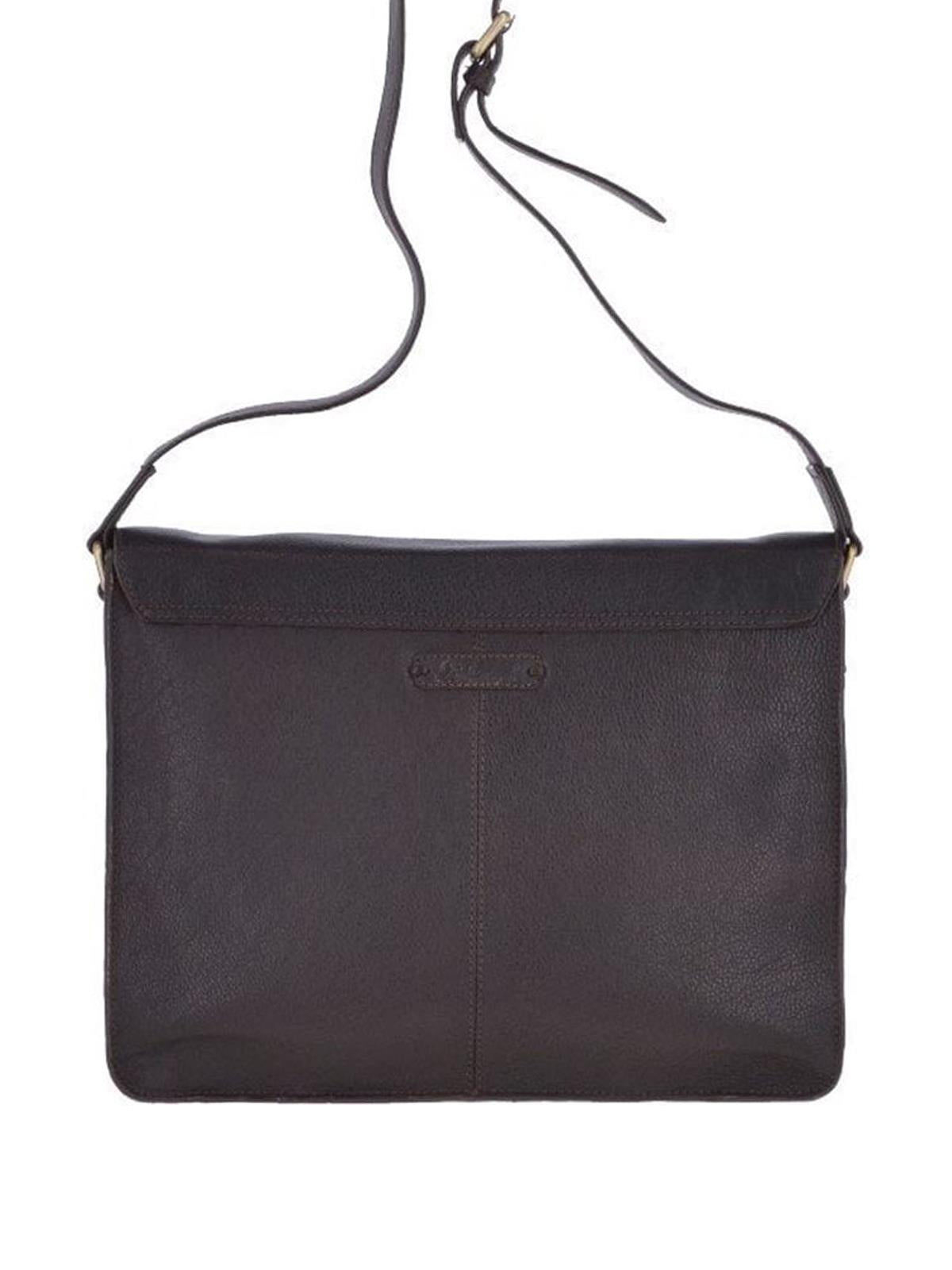 The satchel bag features a fold-over buckled flap that is secured with a press stud for ease of access. The bag has a large pocket beneath this flap. Inside, the bag is fully lined, with organiser pockets and an additional internal leather trimmed zip pocket. It's carried with a comfortable adjustable shoulder strap.