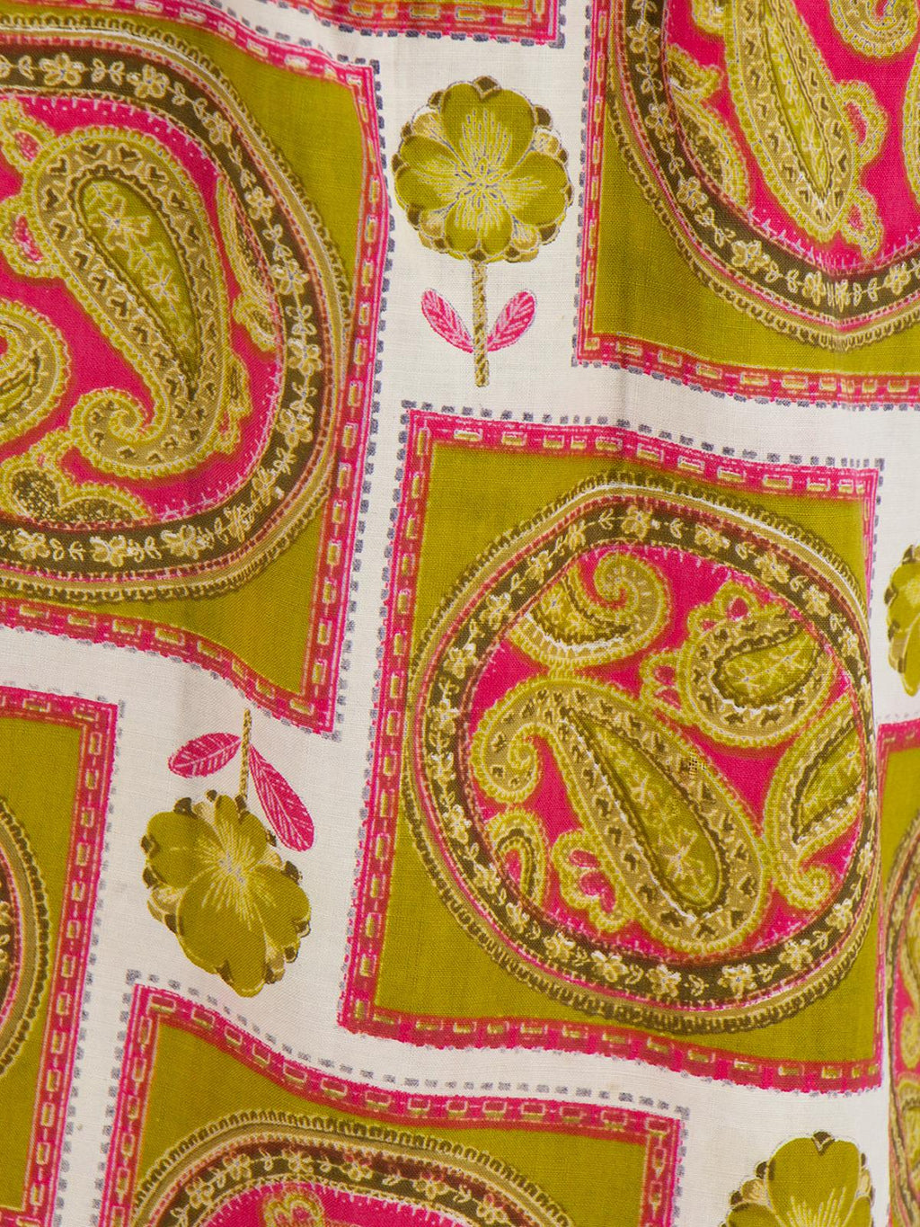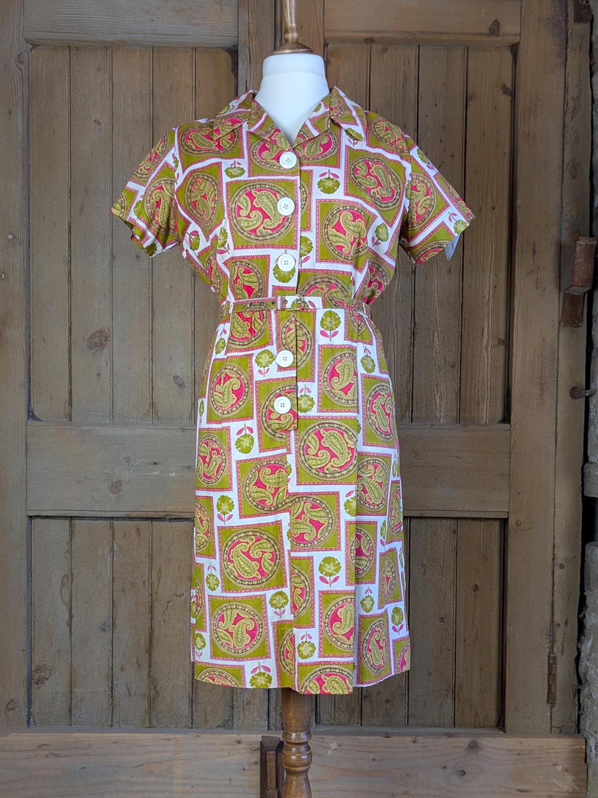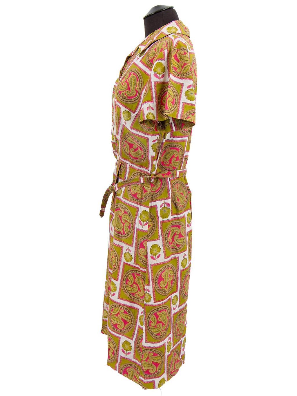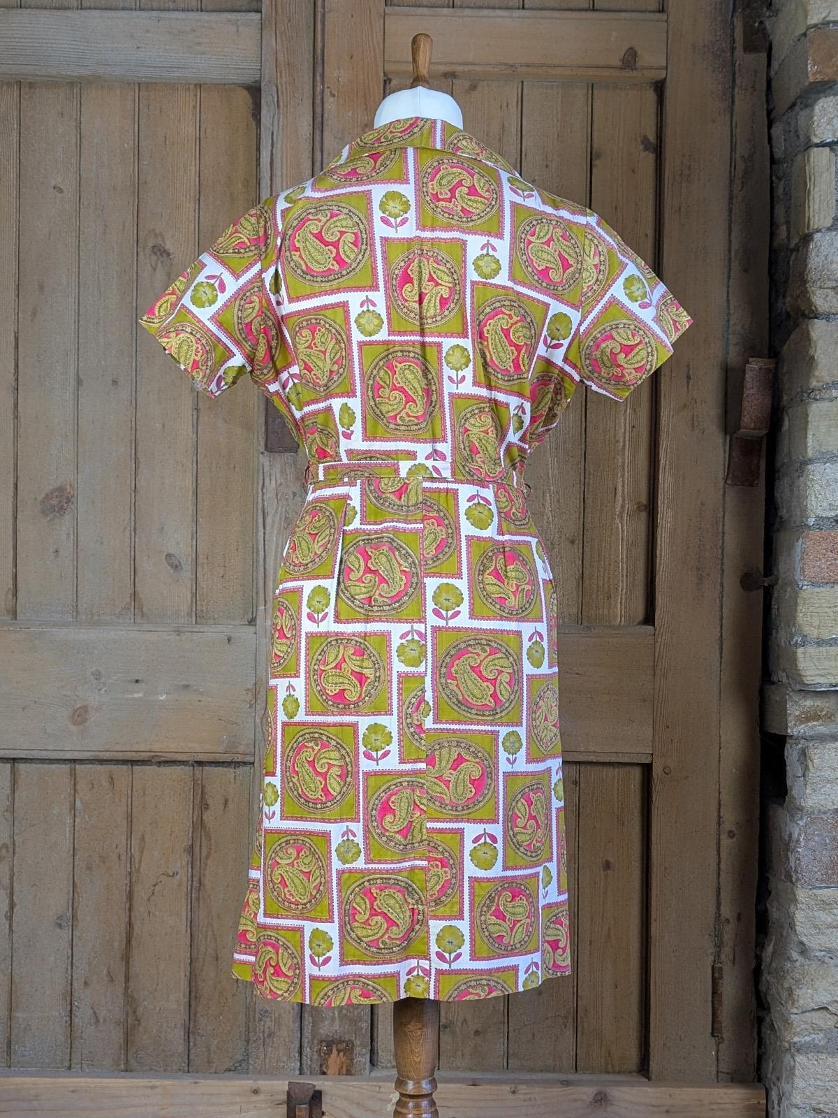 In contrast to its practical 50s shirt-style cut, this lightweight cotton dress is printed in a colourful paisley pattern in olive and pink.