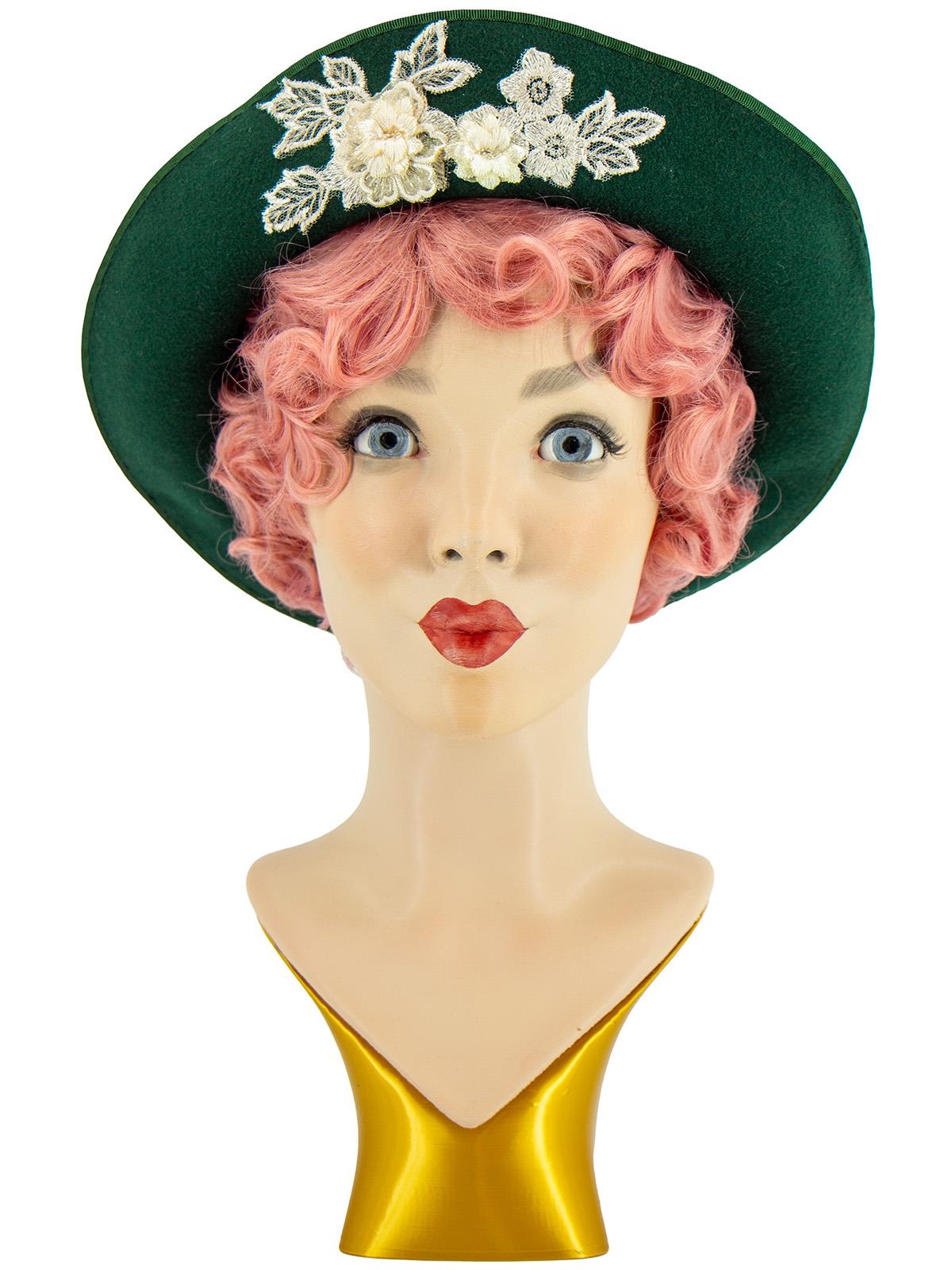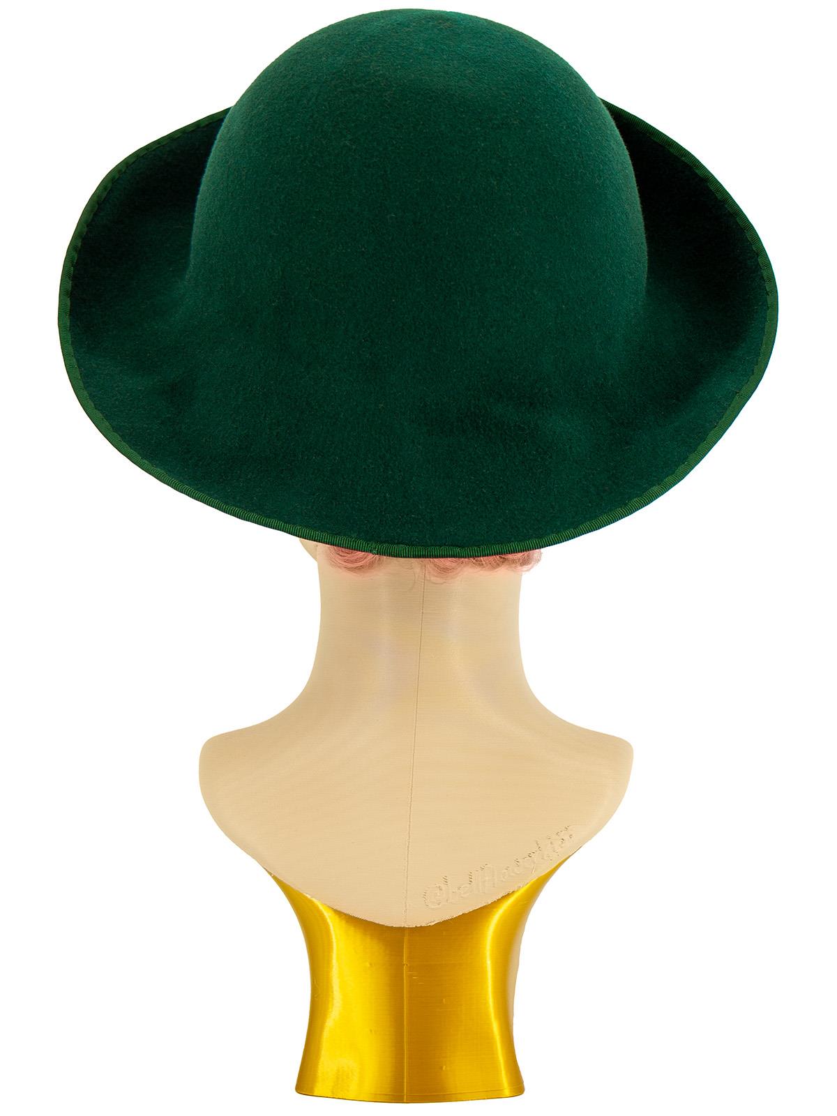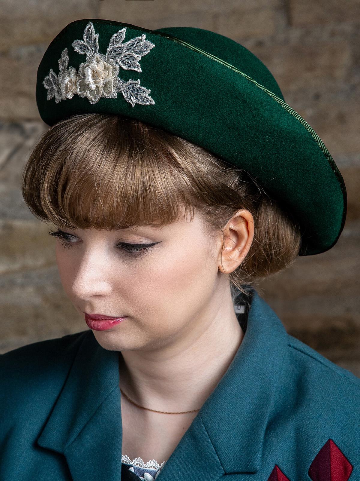 This handmade vintage replica hat is a 1940s halo style, in a rich bottle green shade, and features an attractive cream rose applique across the brim. The halo shape frames the face and hair exquisitely. Whether you wear it out on the town, to a vintage nostalgia event, or a ladies' brunch, this hat is sure to become the showstopping element in any forties-inspired outfit.