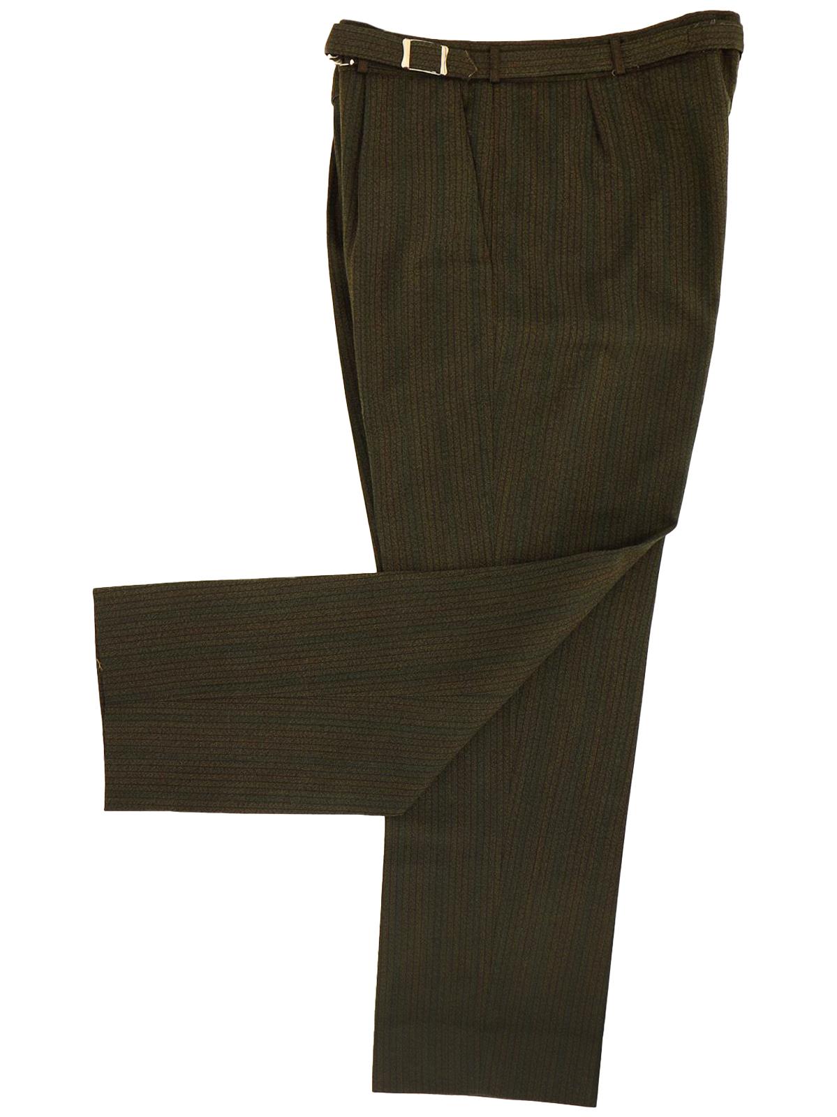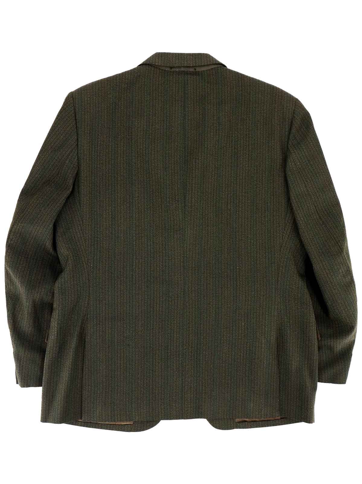 Realised in a mottled green with black narrow stripes throughout, the jacket has a two-button single-breasted fastening with two flap pockets, a breast pocket, and double back vents. The trousers have a single side seam pocket and a bound pocket at both the back and front. The trousers also feature a belt made from the same fabric with a silver buckle fastening.