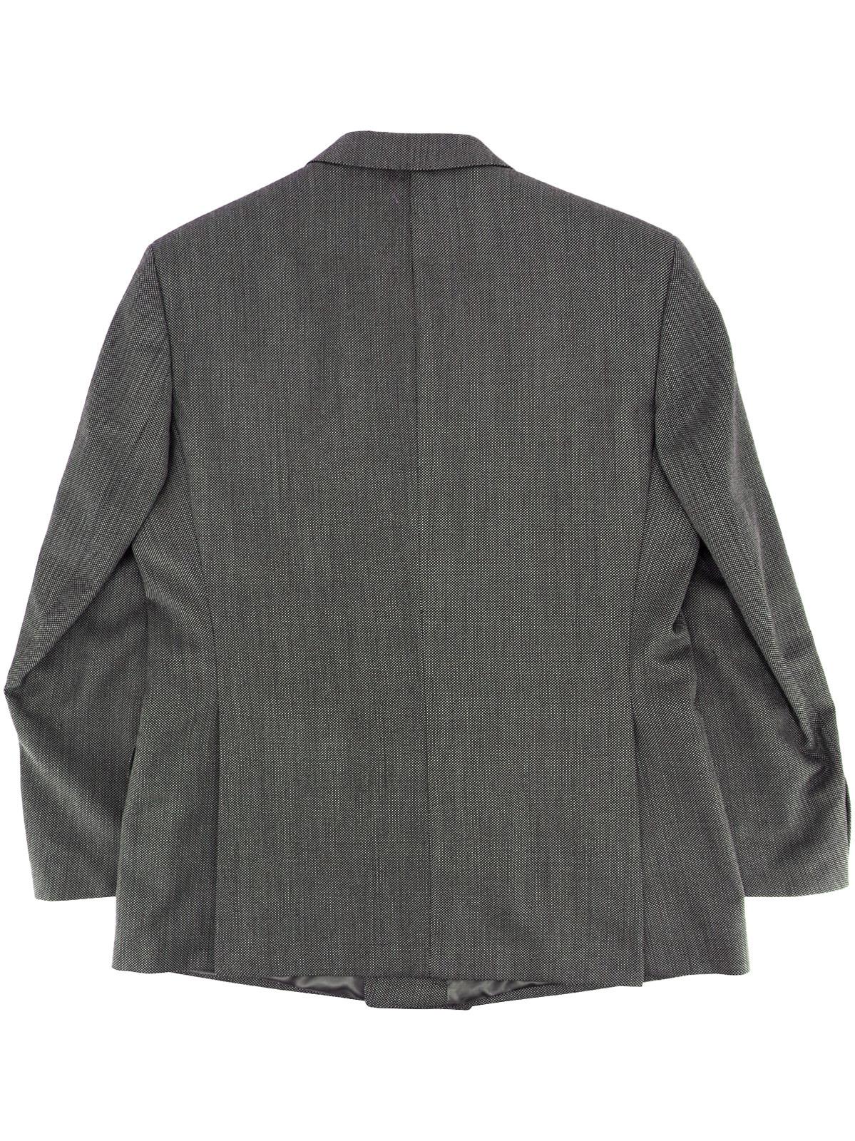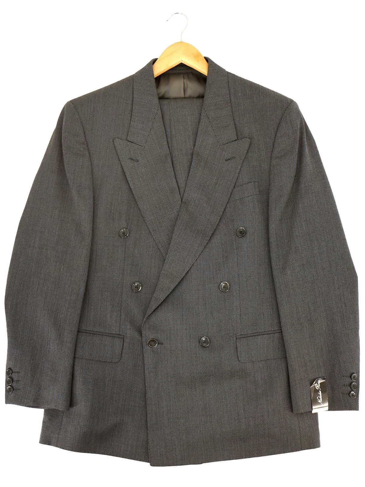 Grey suiting cloth in a birdseye pattern. The double-breasted jacket has broad peak lapels with twin back vents.