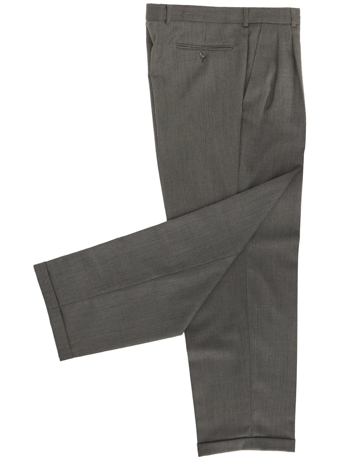 The matching trousers have pleats at the front and turn-up cuffs. Two slanted pockets at the side and two bound pockets at the back.