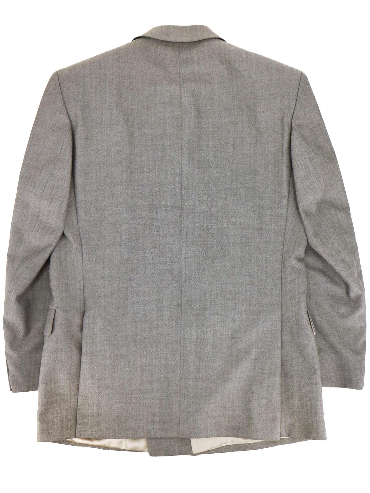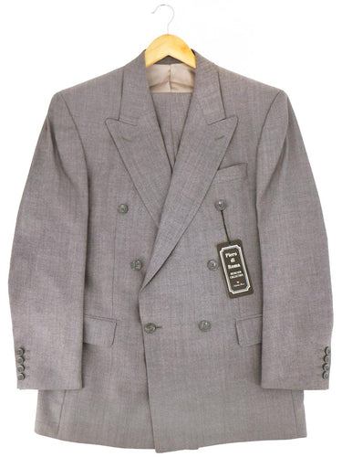 Grey suiting cloth with a viscose lining. The double-breasted jacket has broad peak lapels with two back vents.