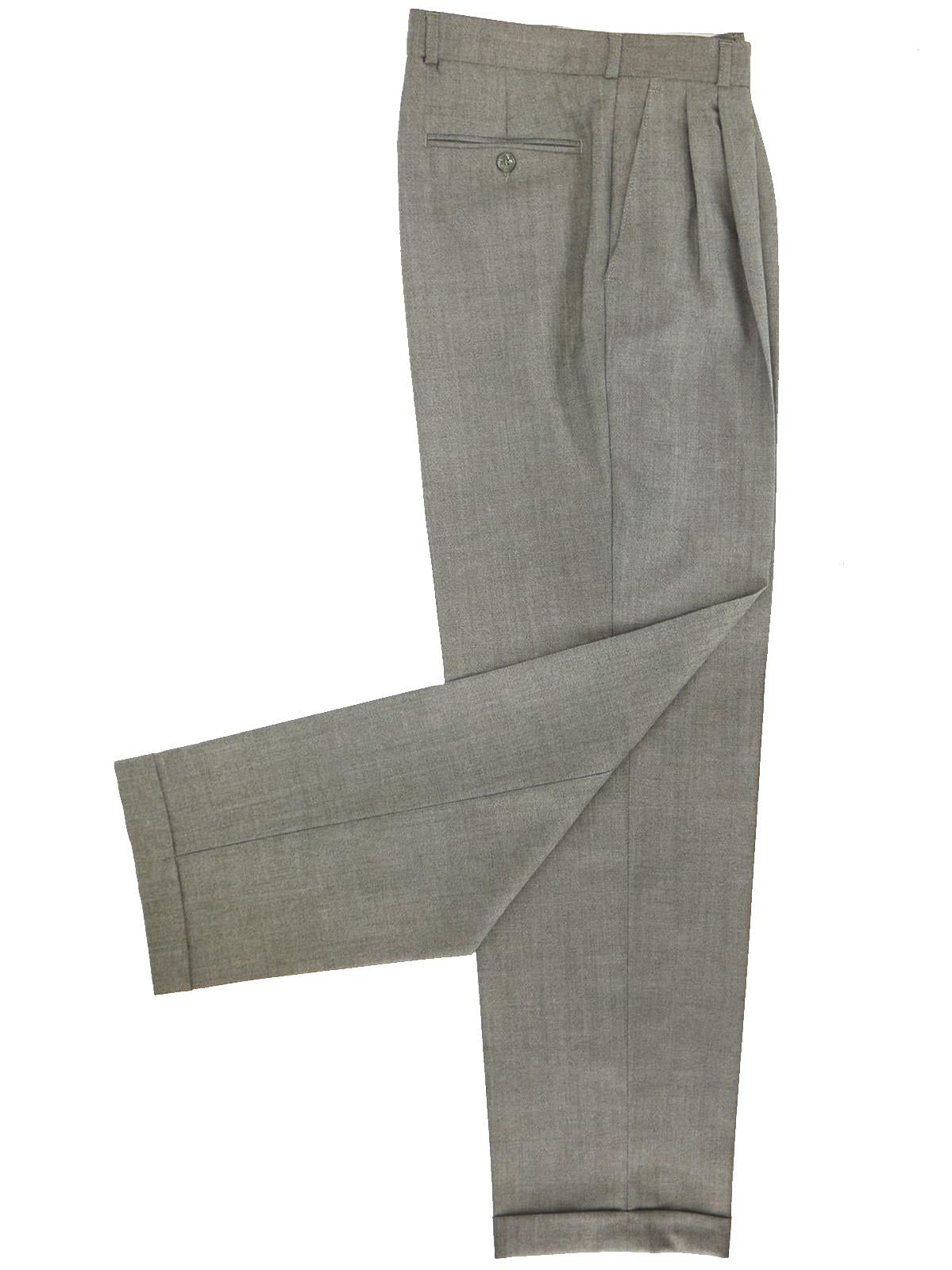 The matching trousers have pleats at the front and turn-up cuffs. Two side pockets and a single bound pocket at the back.