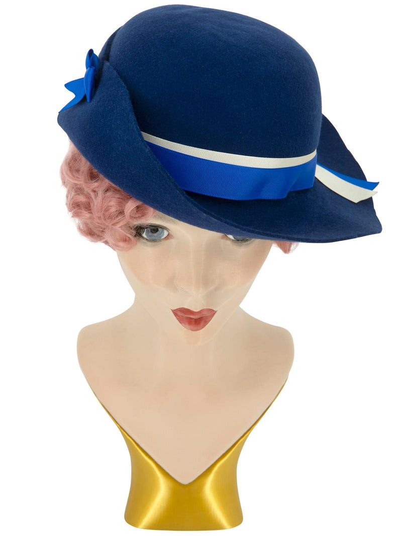 Part of the exclusive Lilegance for Socialite collection, this handmade vintage replica tilt hat is inspired by elegant 1940s and 1950s millinery designs. Made in the UK by independent artisan hatmaker Lilegance, it is crafted from 100% pure wool felt in a striking dark blue shade. The hat features a rounded crown shaped to hug the head for a secure fit, and is accented with a coordinating grosgrain ribbon band and a feature bow detail positioned at the back. Fully lined to protect the pure wool felt, this hat is a chic, period-accurate accessory perfect for events or everyday vintage styling.