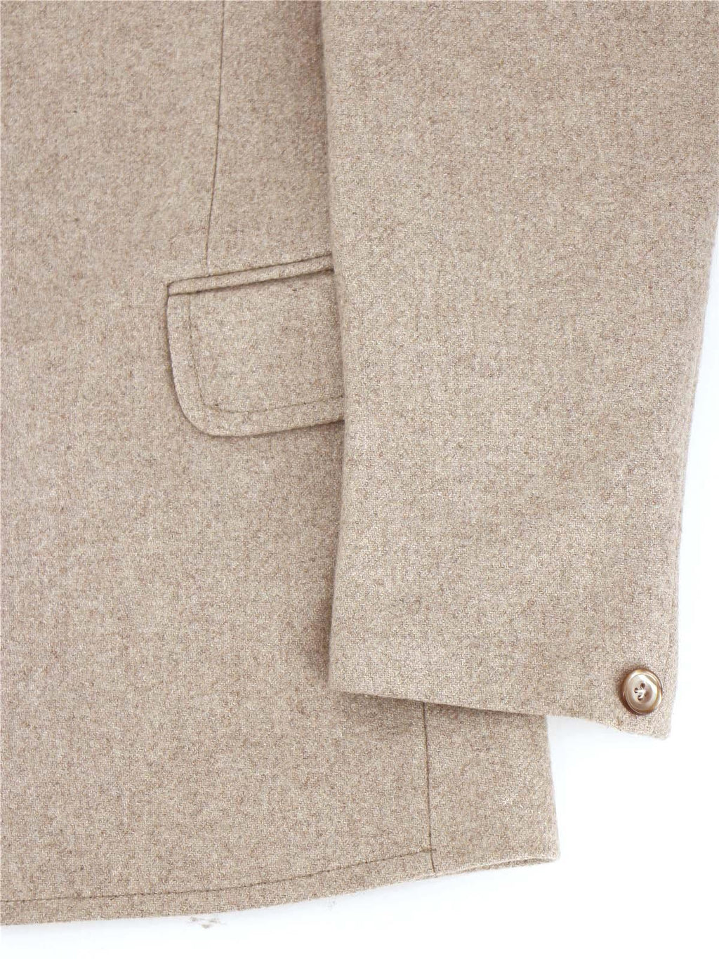 An eye-catching Hardy Amies jacket in a classic oatmeal beige shade with a subtle flecked texture. It features a three-button fastening and a wide collar; these tailoring choices make it truly optimal for emulating a 1940s or 50s look.