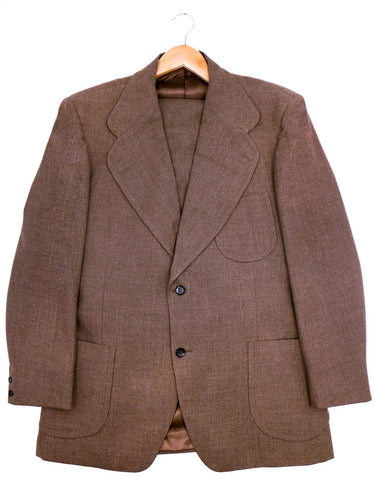 1970s era suit, made of pure wool suiting cloth in a flecked brown. Extra-wide rounded notch lapels give the suit some incredible vintage seventies character, as do the large patch pockets and Oxford bag style trousers with large turn-ups.