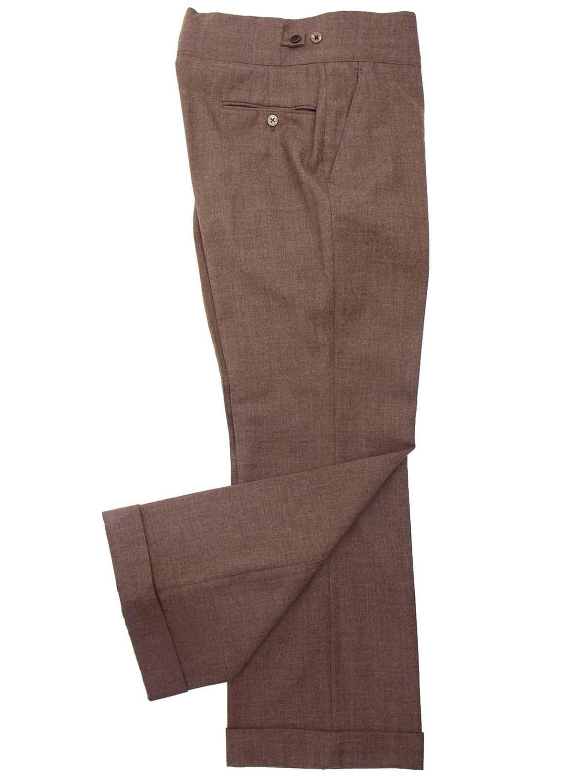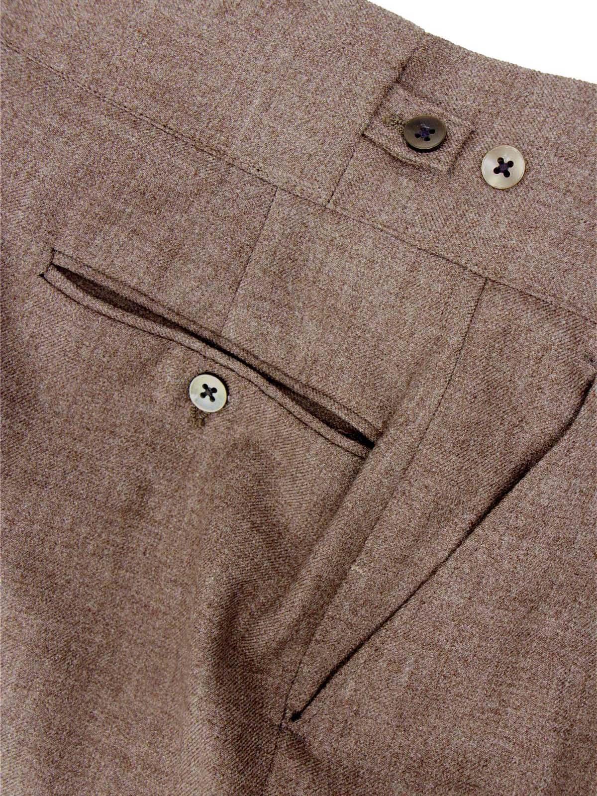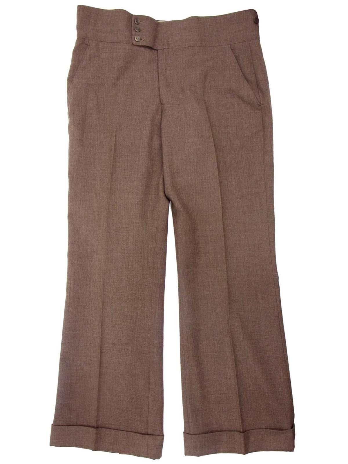 Trousers are flat-fronted, with three pockets. The waist can be adjusted with buttons on the side.