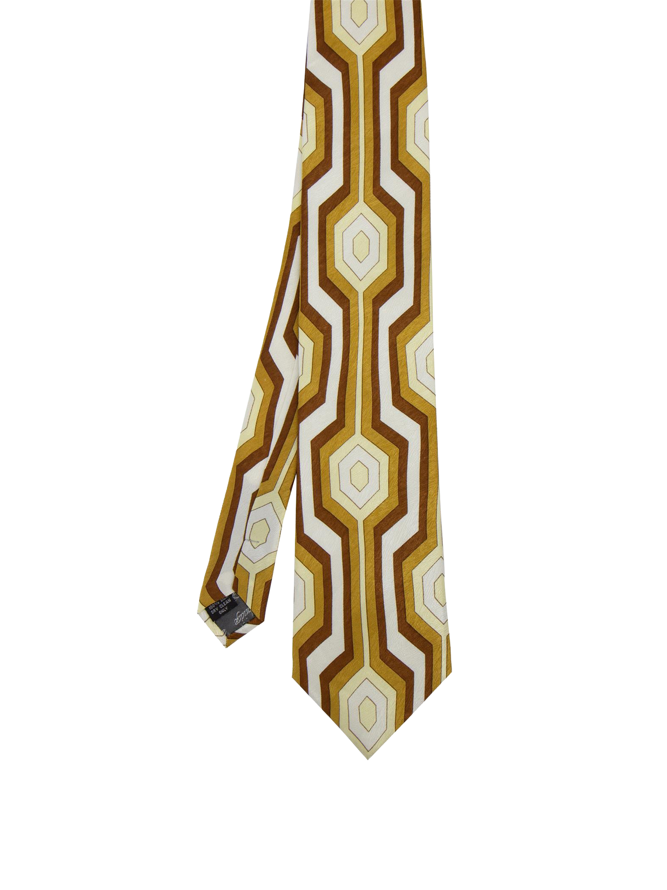 Kensington tie with geometric brown, mustard, and pale yellow design.