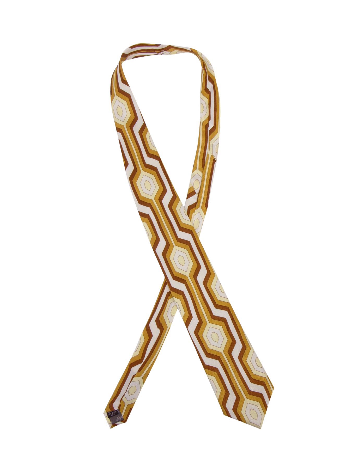 A Kensington pure silk tie in a vintage style geometric pattern of brown, mustard, and pale yellow. With its bold colour palette and sheen, it’s the perfect accessory for 1960s or 1970s ensembles. Made in the UK from 100% silk.