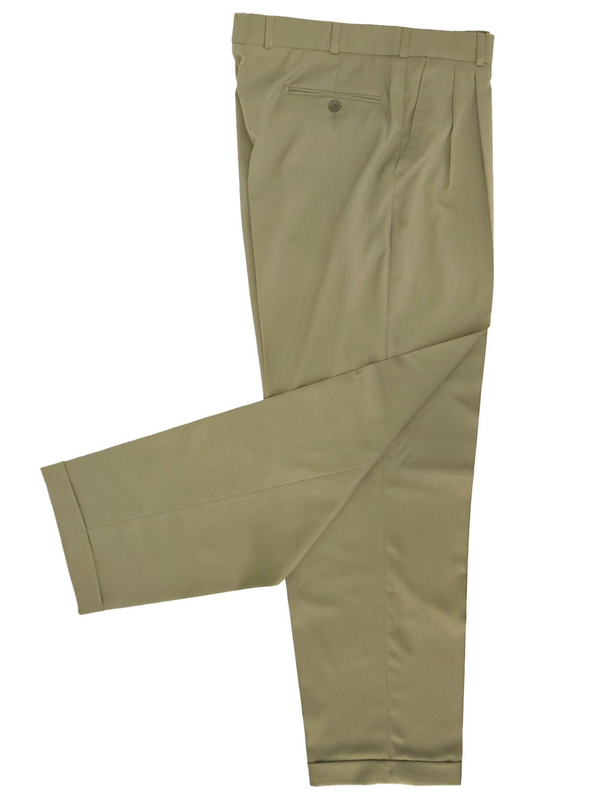 The matching trousers have twin pleated fronts and turn-up cuffed hems. Two slanted side pockets and two back pockets.