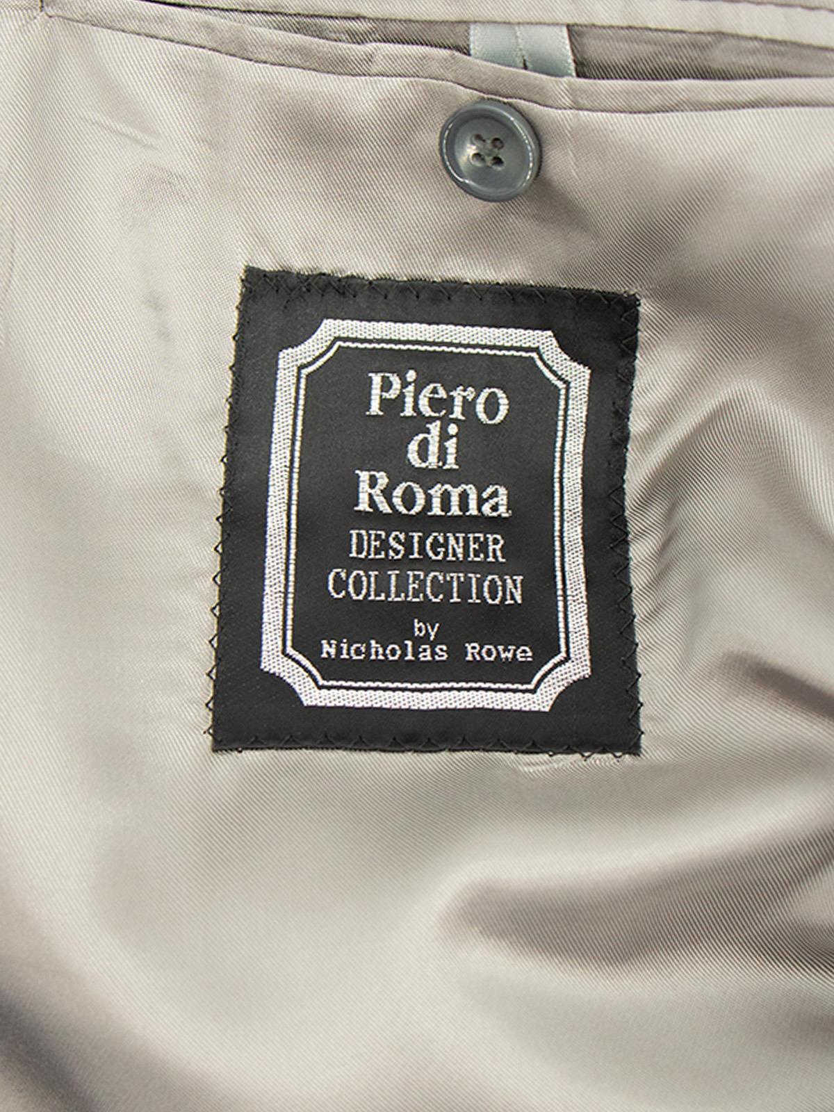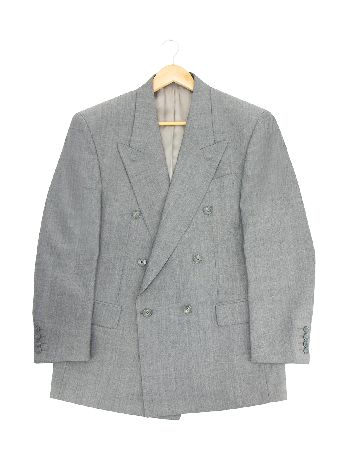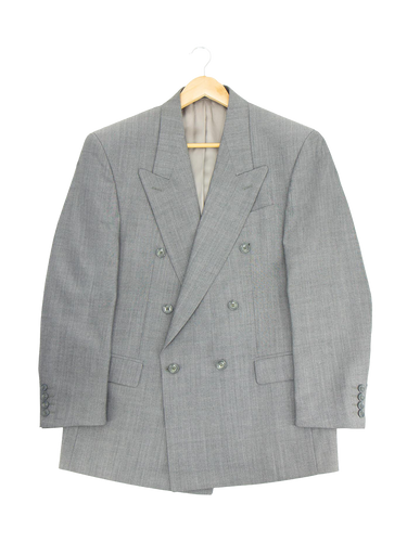 A lightweight, wool mix suit in the classic demob style. Featuring wide peak lapels, a double-breasted six-button front & two flap pockets. Fully lined in a wonderful light grey, with interior pockets and four button cuffs