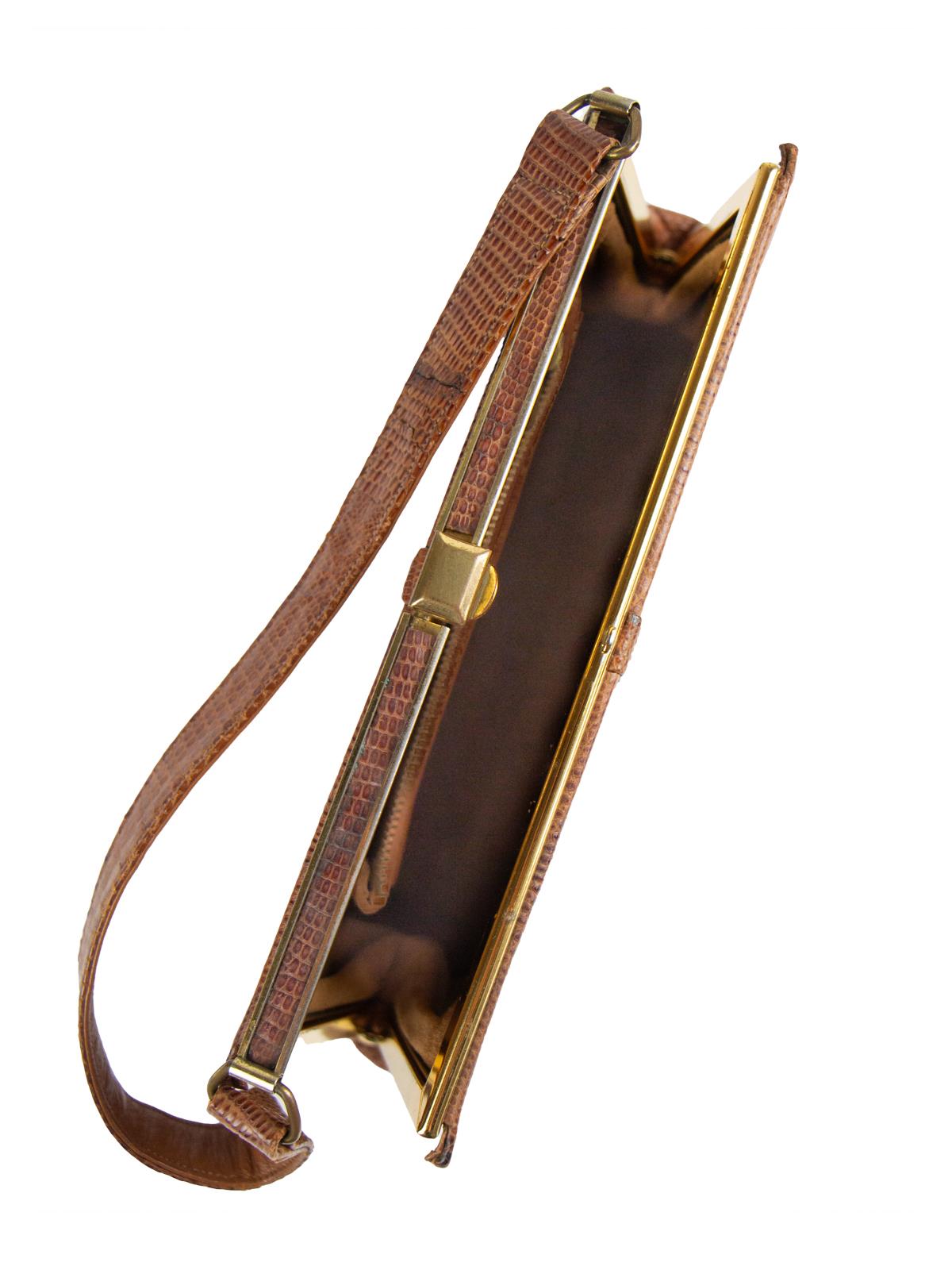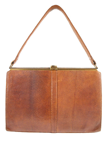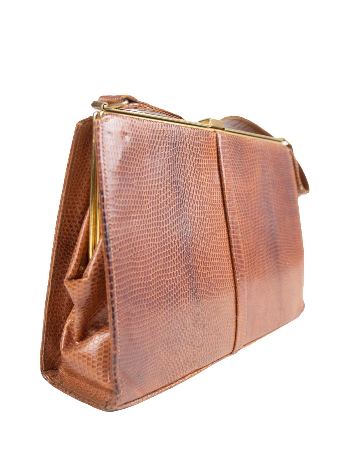 Pale brown lizard skin true vintage handbag with a single top handle.