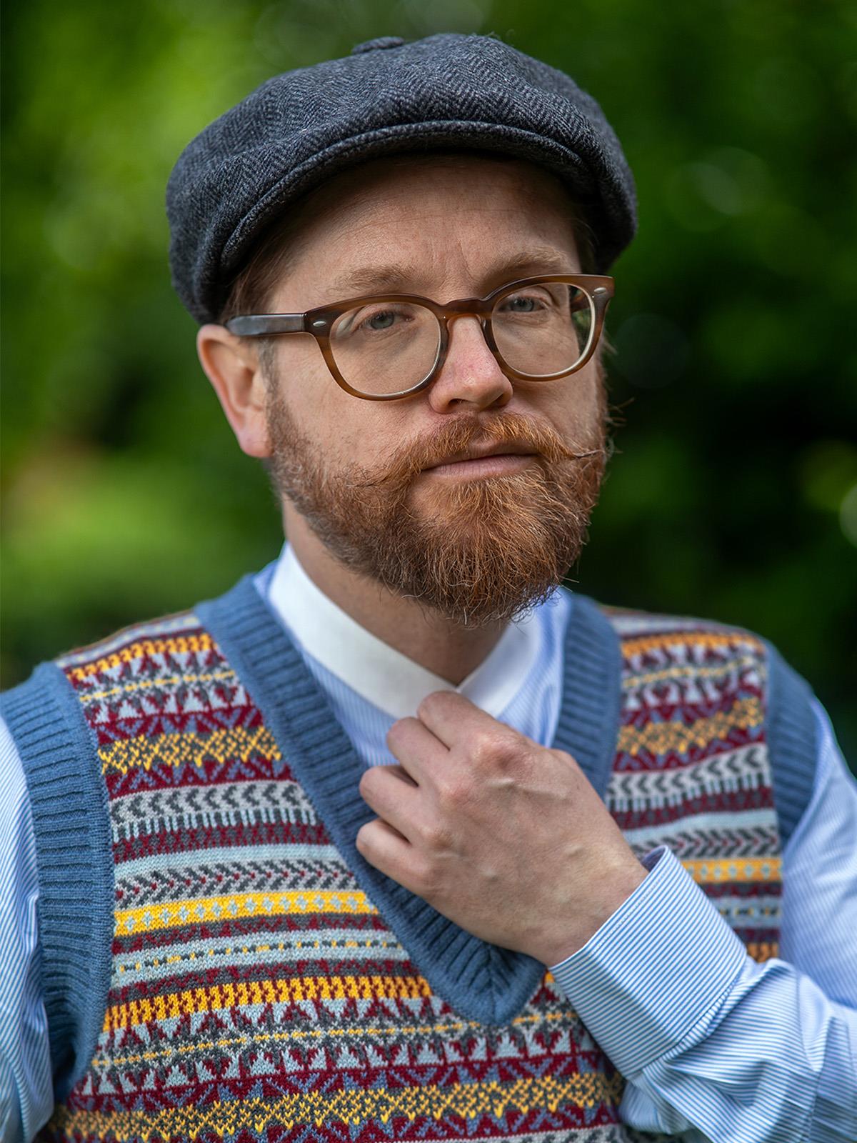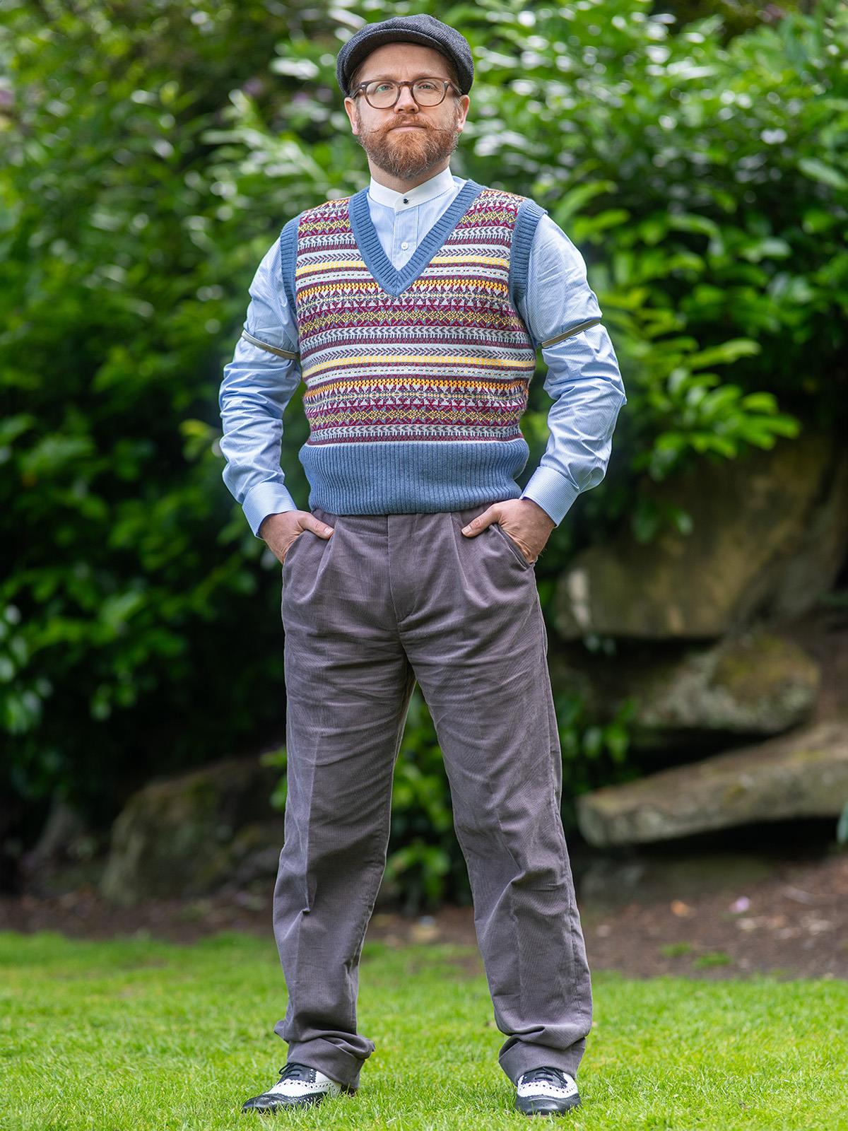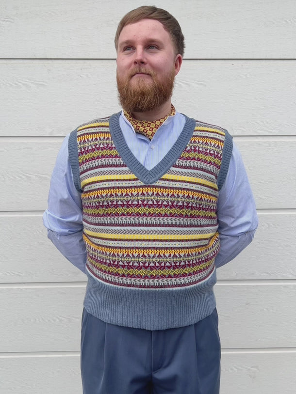 Introducing the Melvin 1940s vintage-inspired knitted vest top, a must-have for any man's vintage collection. The Paridae colourway is a cool-toned blue Fairisle knit with white, yellow and red accents.