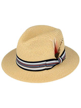 A 1940s-1950s inspired Panama style fedora hat, perfect for summer wear. Crafted from high quality paper straw, it features a smart striped hatband with a feather trim for an authentic vintage touch.