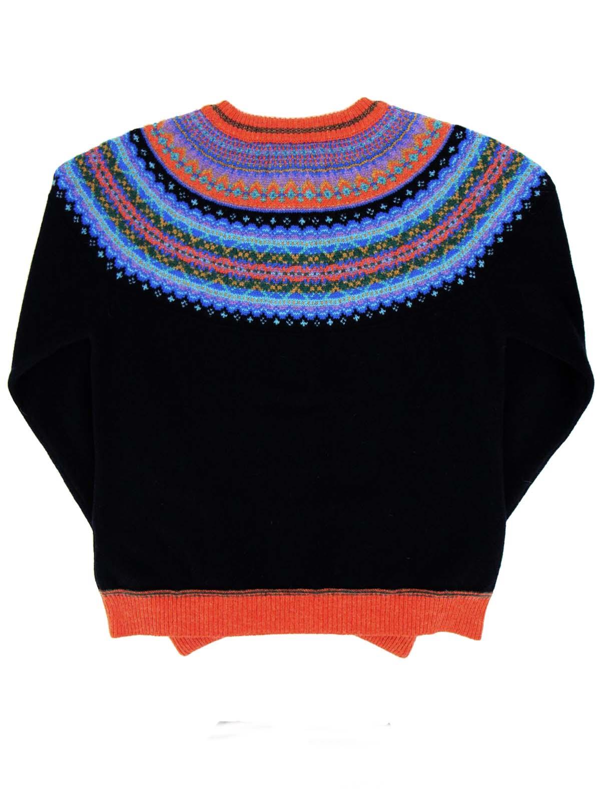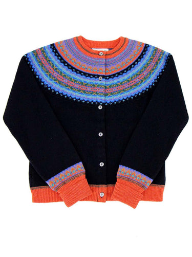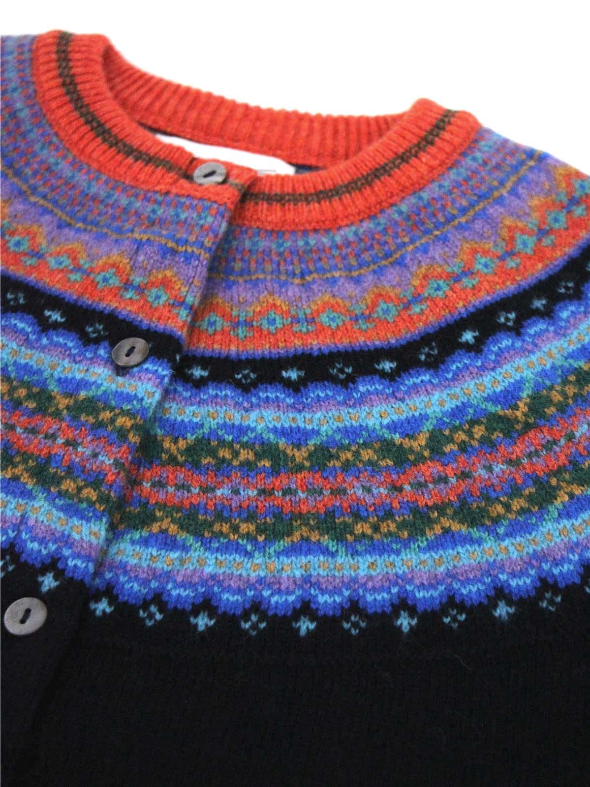 This striking knitted cardigan has a classic 1940s or 1950s era style, owing to its Fairisle knit pattern. Hand-produced in Scotland using quality, natural yarns spun that keep you truly warm, by ERIBÉ, an established knitwear design house and manufacturer that has been in operation for 33 years.