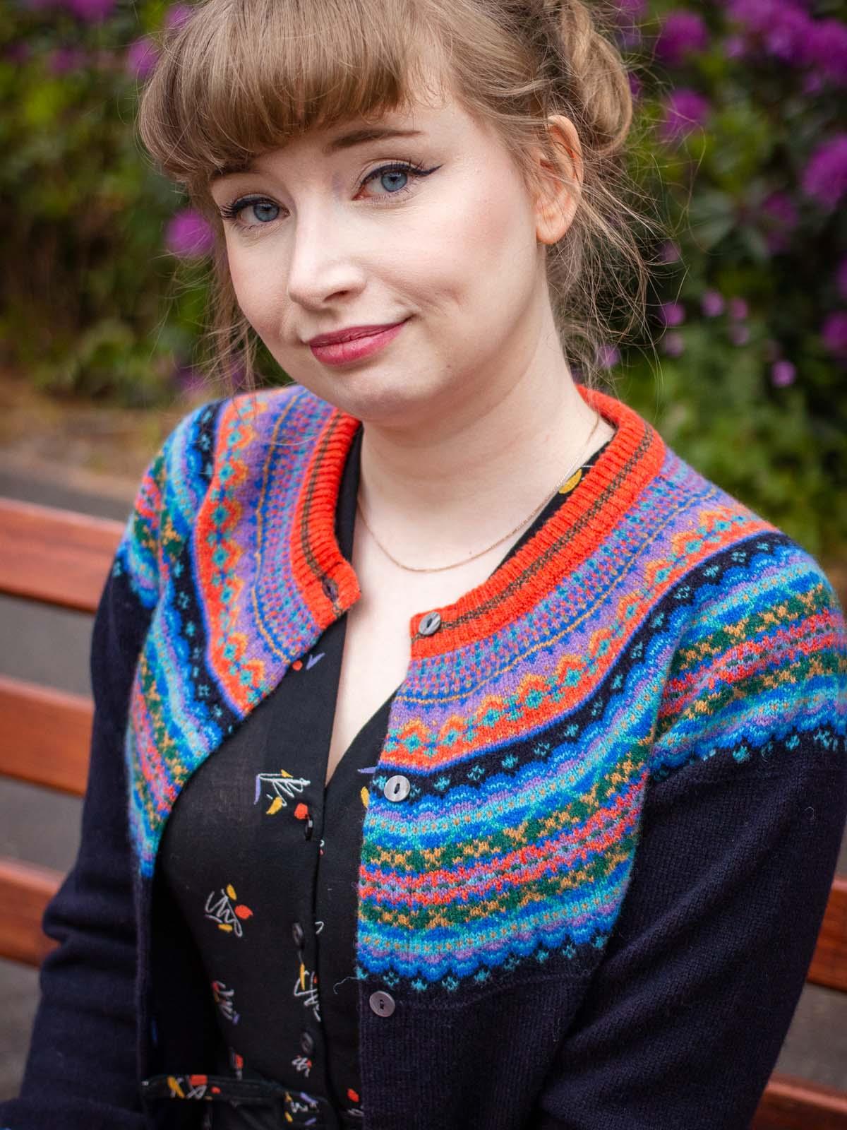 The Enchanted black button-through cardigan is made of pure Scottish wool and features sweet Fairisle patterning in a rounded shape across the shoulders and at the sleeve cuffs. These cardigans are a shorter, slightly cropped length for a more accurate forties look.