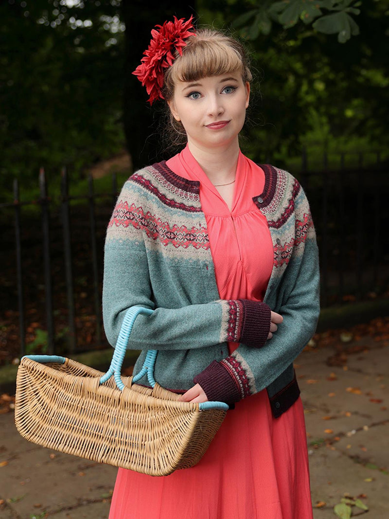 This eye-catching knitted cardigan embodies a timeless 1940s flair with its Fairisle knit design and cropped cut. The cosy pure Merino wool will keep you warm despite being relatively light weight.