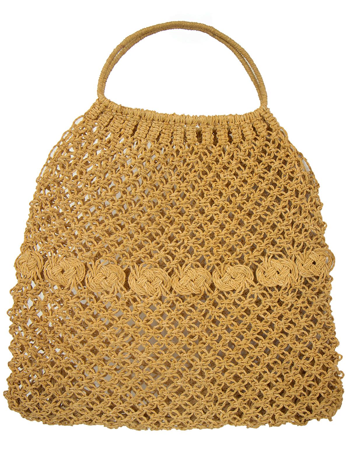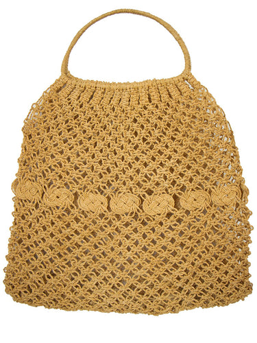 Crochet grocery shopper bag from the midcentury. A natural straw colour woven material with a fabulous feature sailors knot to the centre front and back. Fixed metal handles covered in the same weave, make this easy to carry with heavier shopping items.