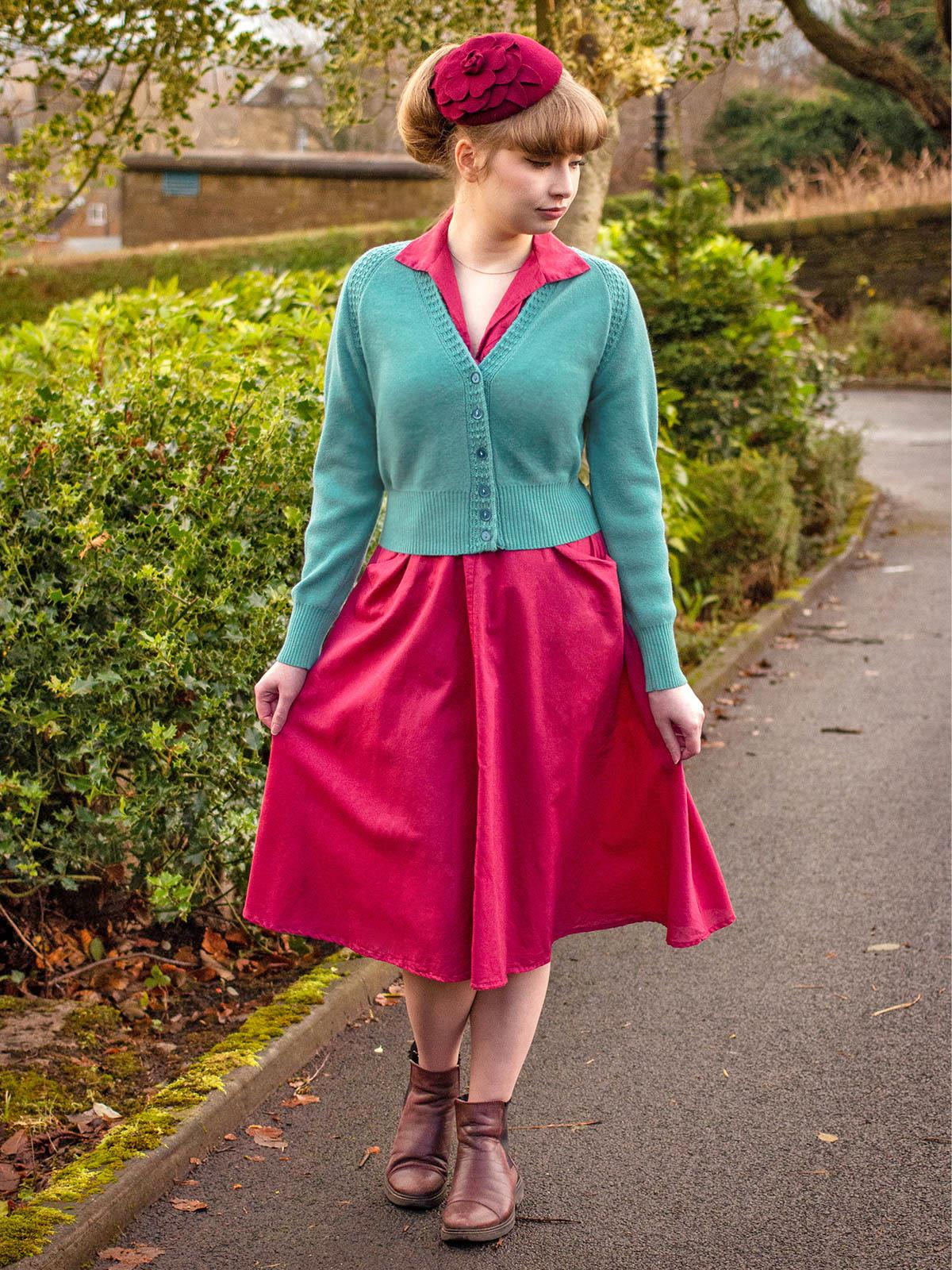 The Jitterbug teal green shade adds a vibrant pop to any midcentury wardrobe. Whether paired with floral swing dresses or high-waisted denim, this versatile knit is a must-have layering piece for every season.