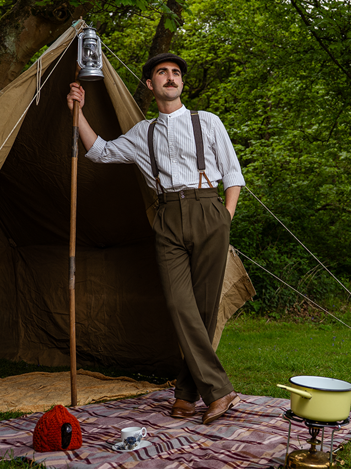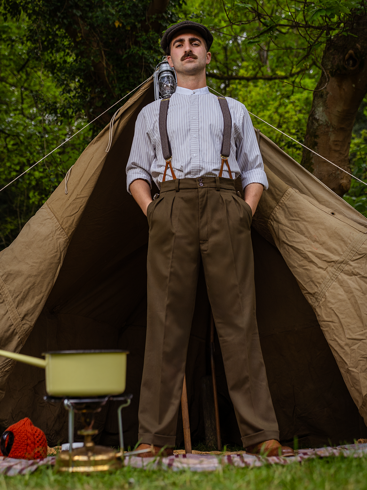 Our Edwards trousers are an authentic reproduction of a late 1940s design, now updated with the added practicality of belt loops. This edition comes in a distinctive bark green-brown colourway, true to midcentury menswear styling.