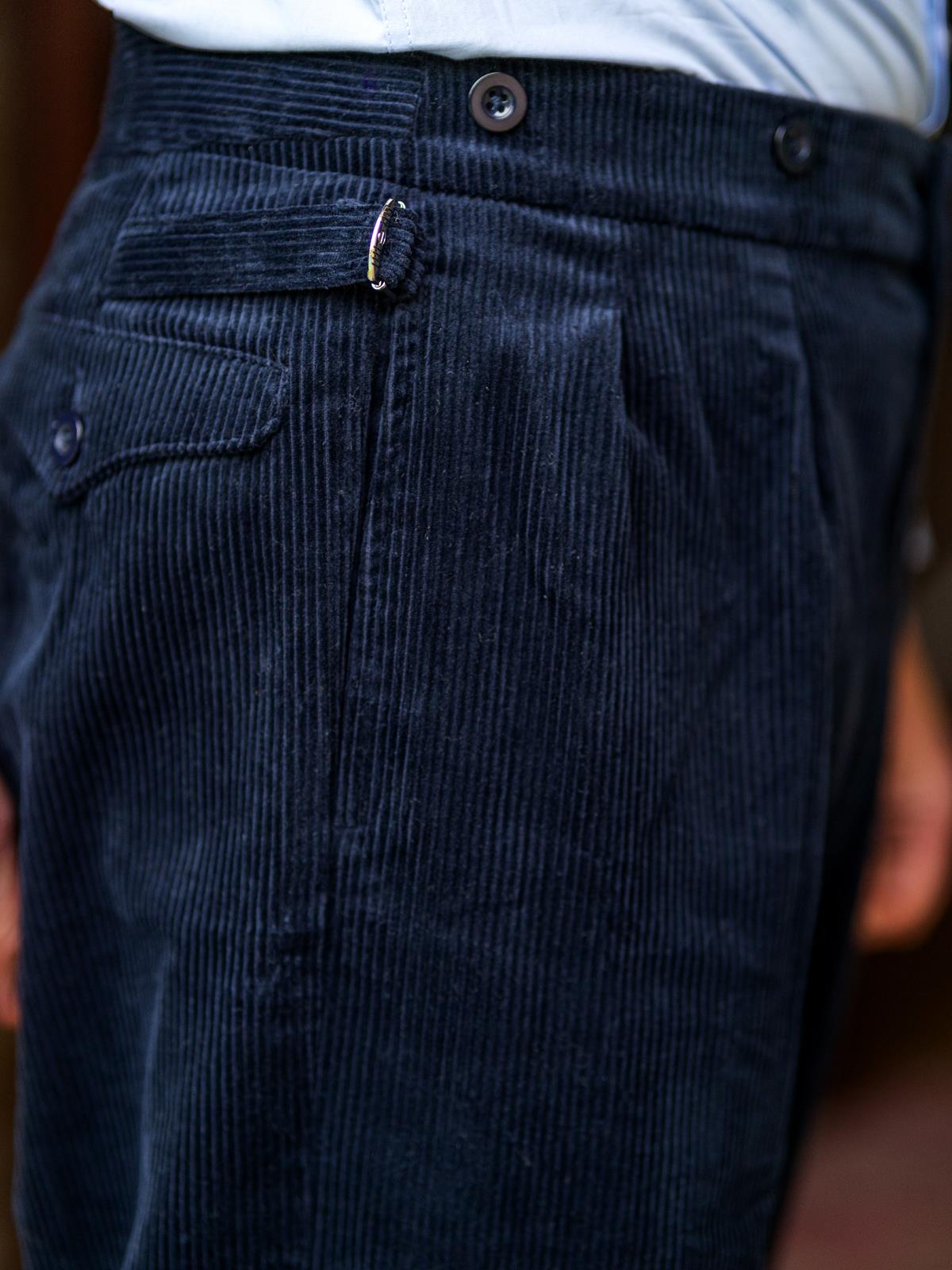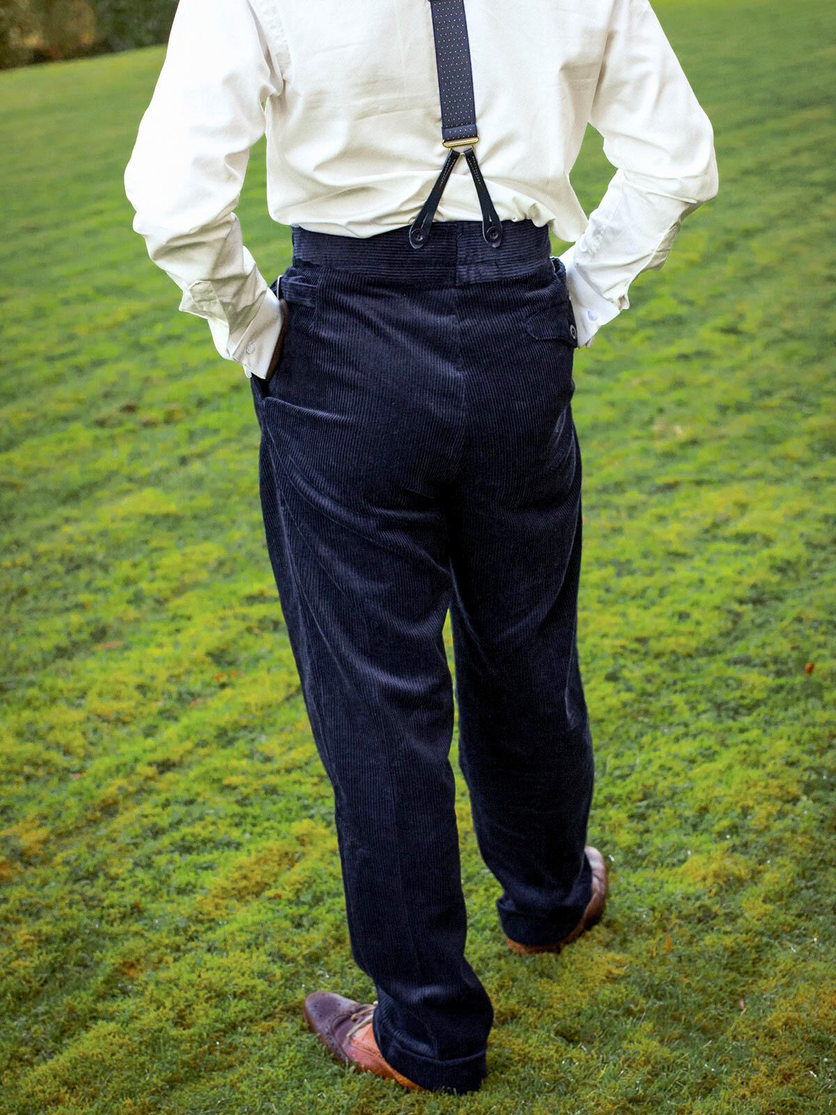 Presenting another fine example of our authentic reproduction trousers, faithfully recreated from a late 1940s original in our archive. This version of our Edwin trouser is made from soft, tactile cotton corduroy in a navy blue, a perfect choice for cooler seasons and vintage styling.
