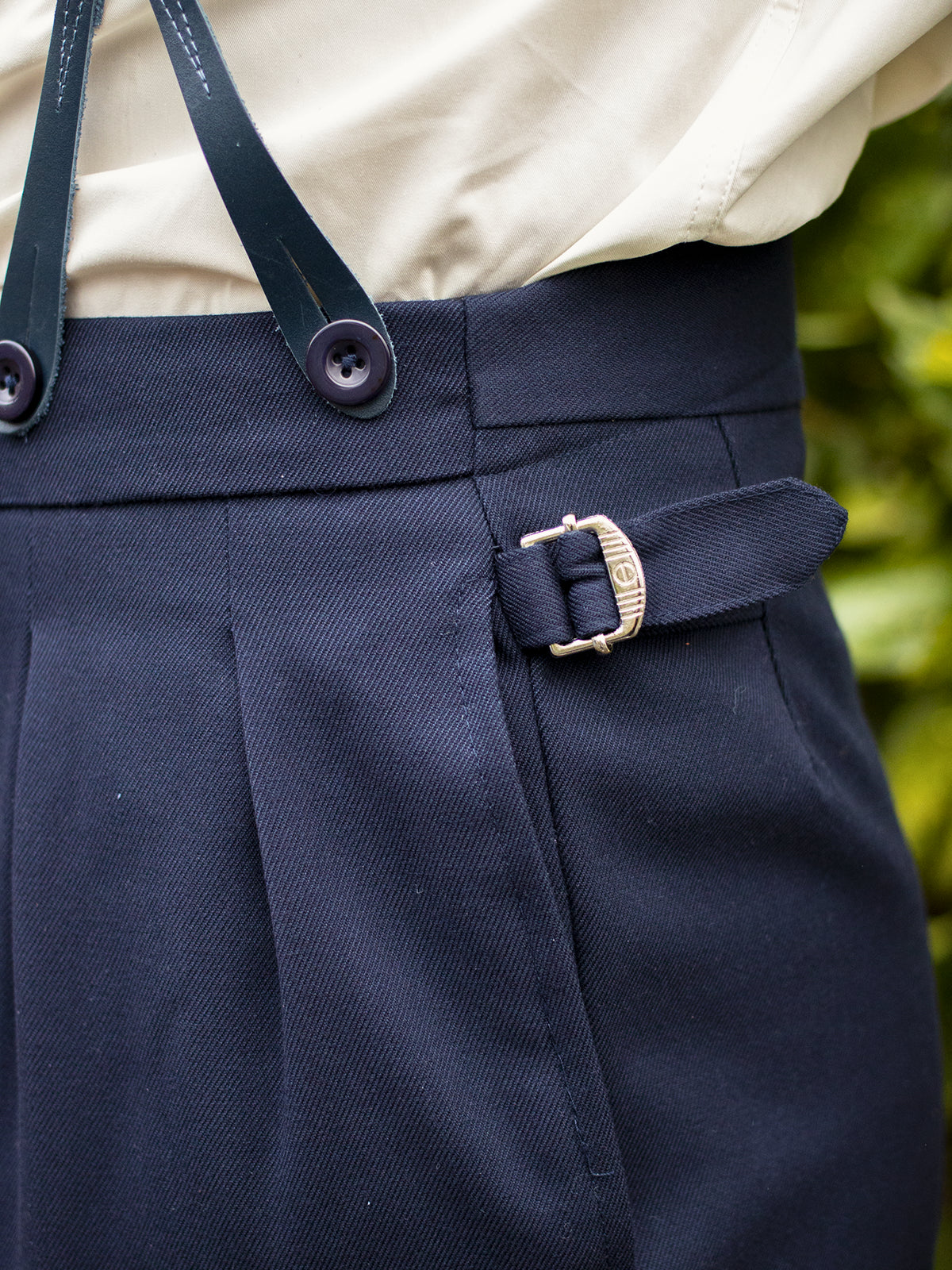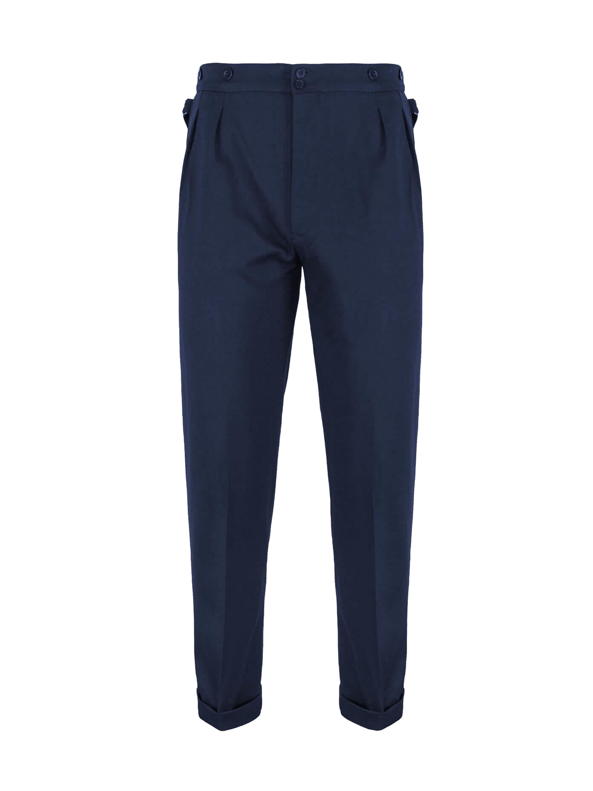 Presenting the Edwin trousers in classic dark navy blue, another pair of authentic reproduction trousers from our archive. These are faithful replicas of a late 1940s original, capturing every detail of true period tailoring.