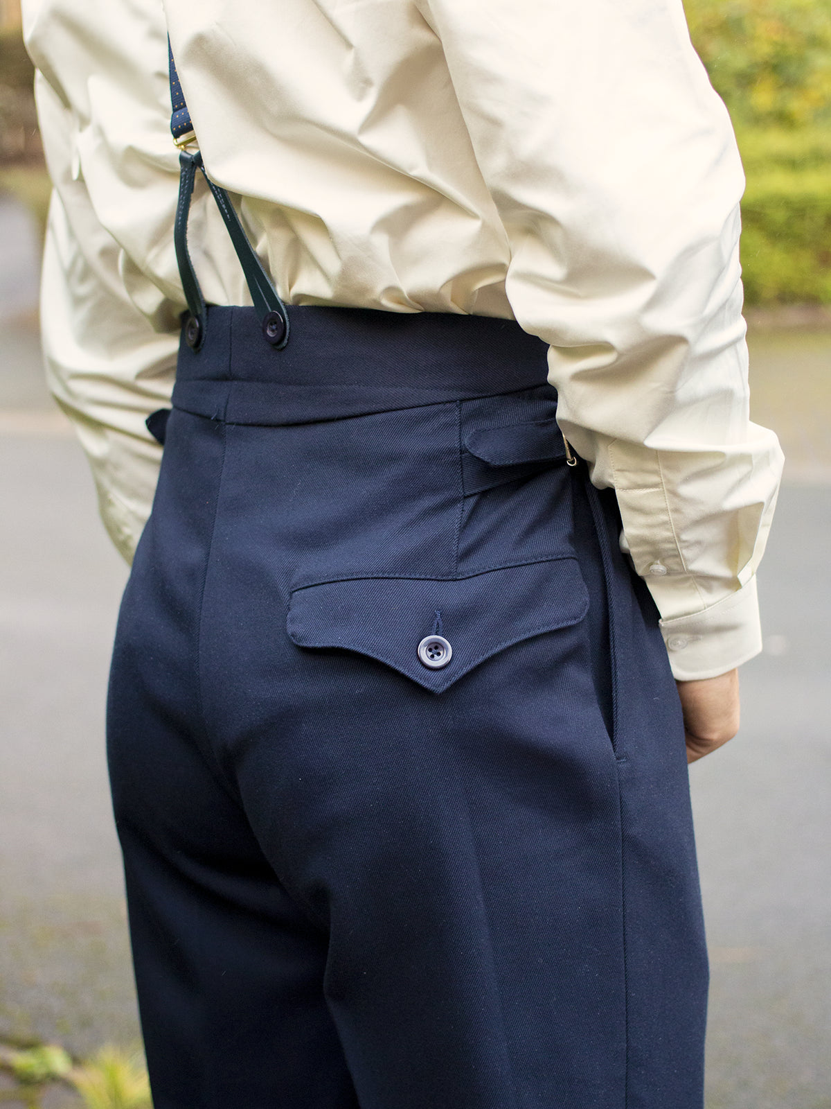 Our trousers are designed to be worn high-waisted, sitting higher on the body than most modern trousers.  If you typically wear a size 34" or larger, we recommend ordering one size up to ensure a comfortable fit.