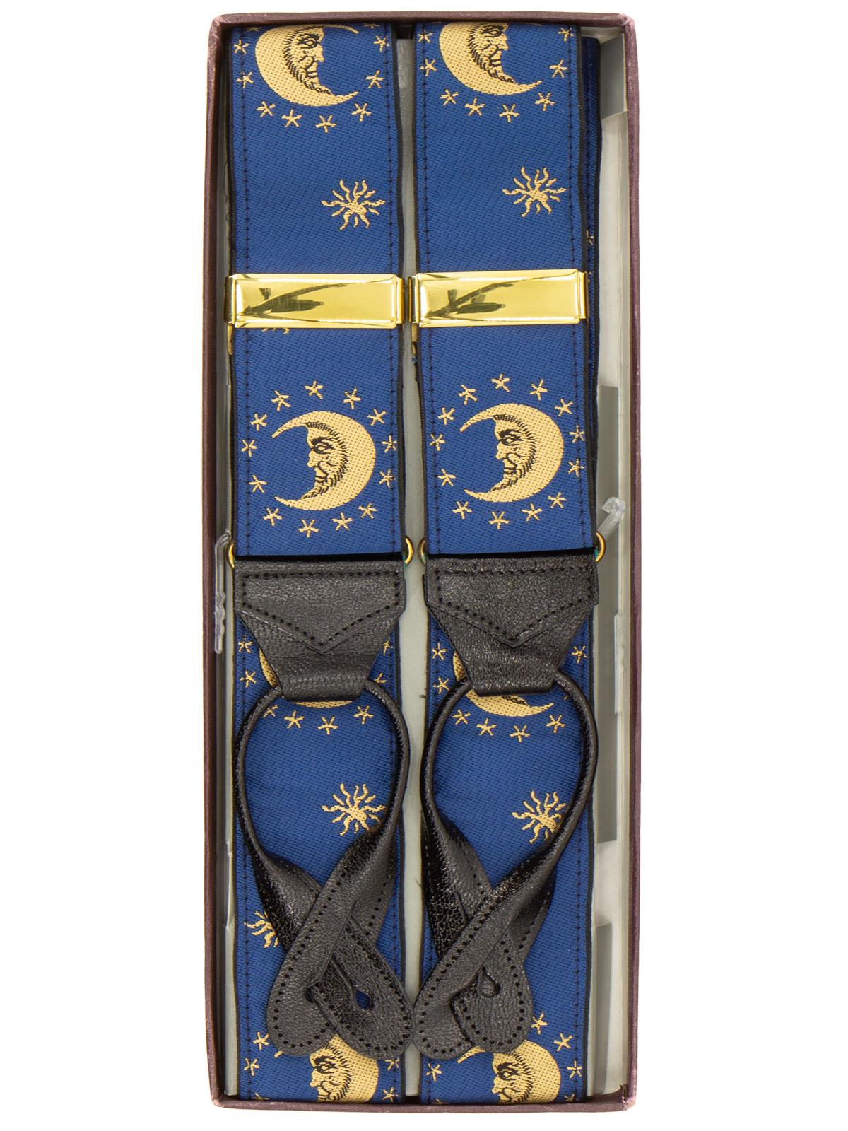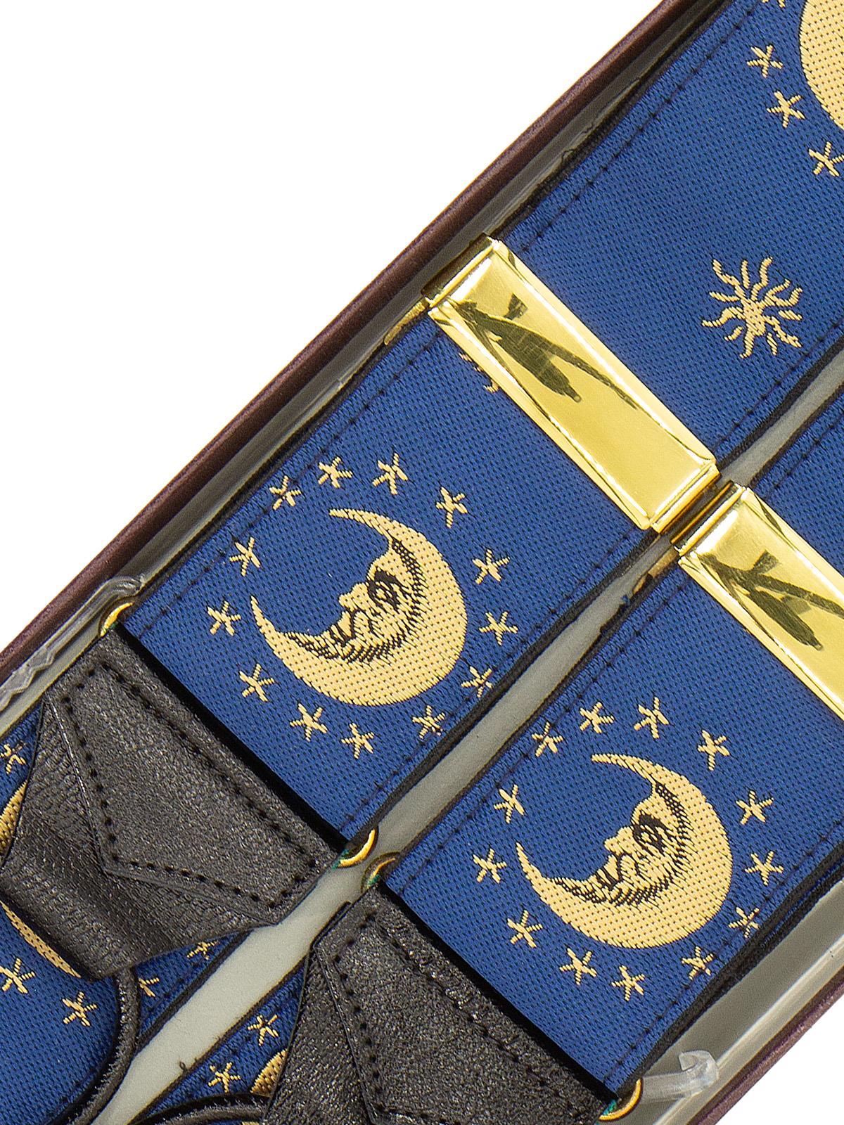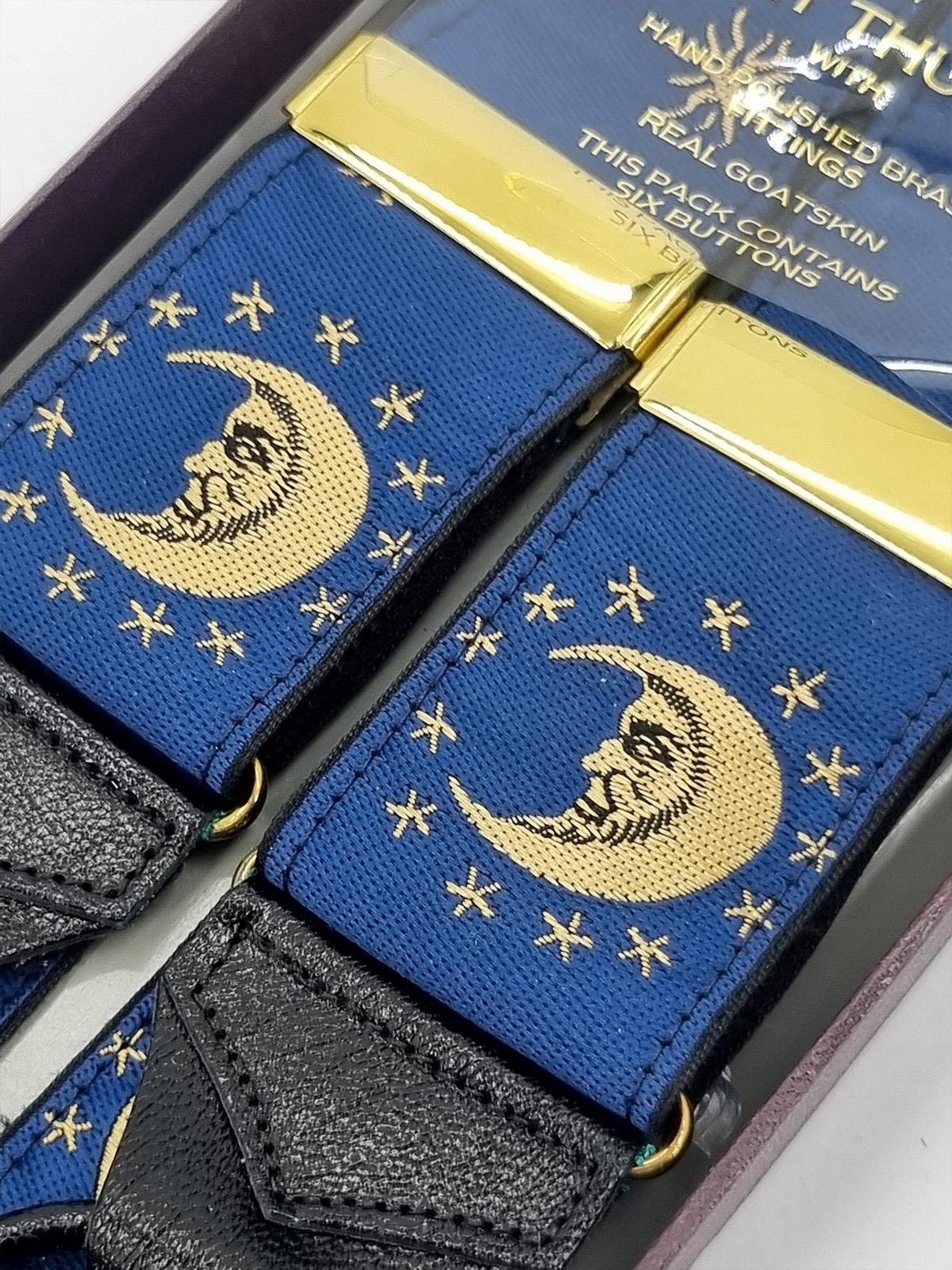 Gold moon and stars repeat pattern on a night sky blue background with polished black leather loops to attach to trousers with waist buttons.