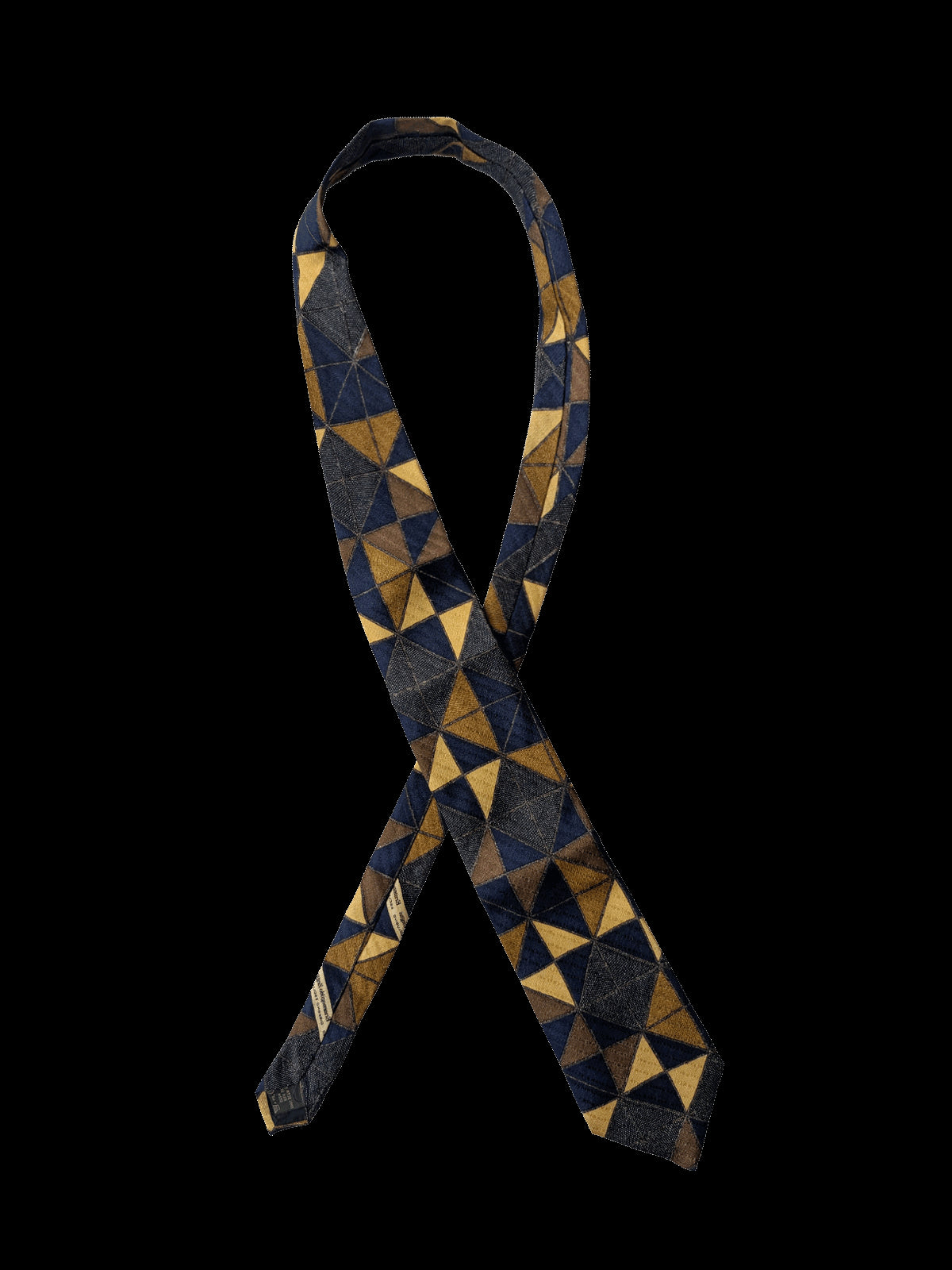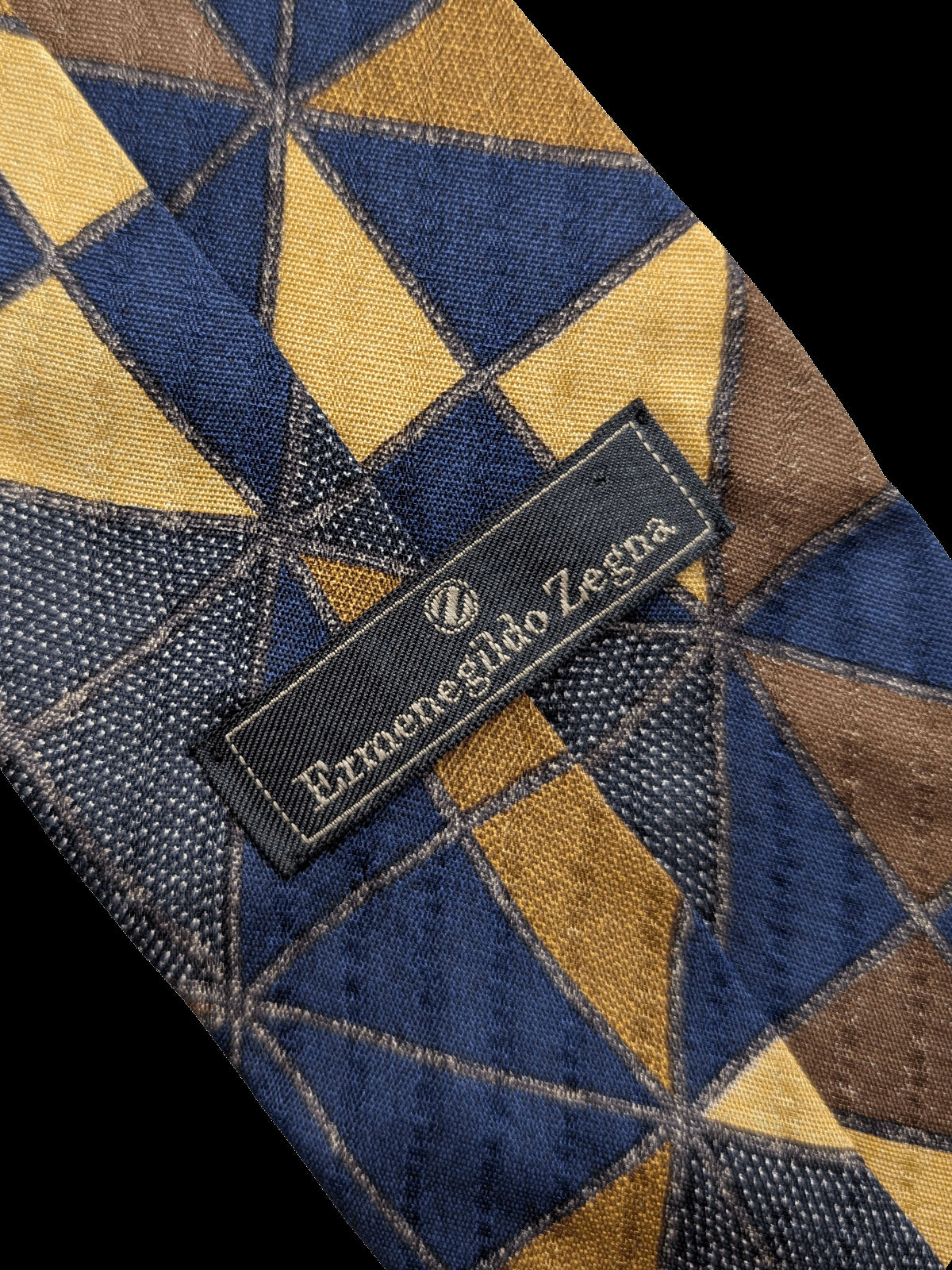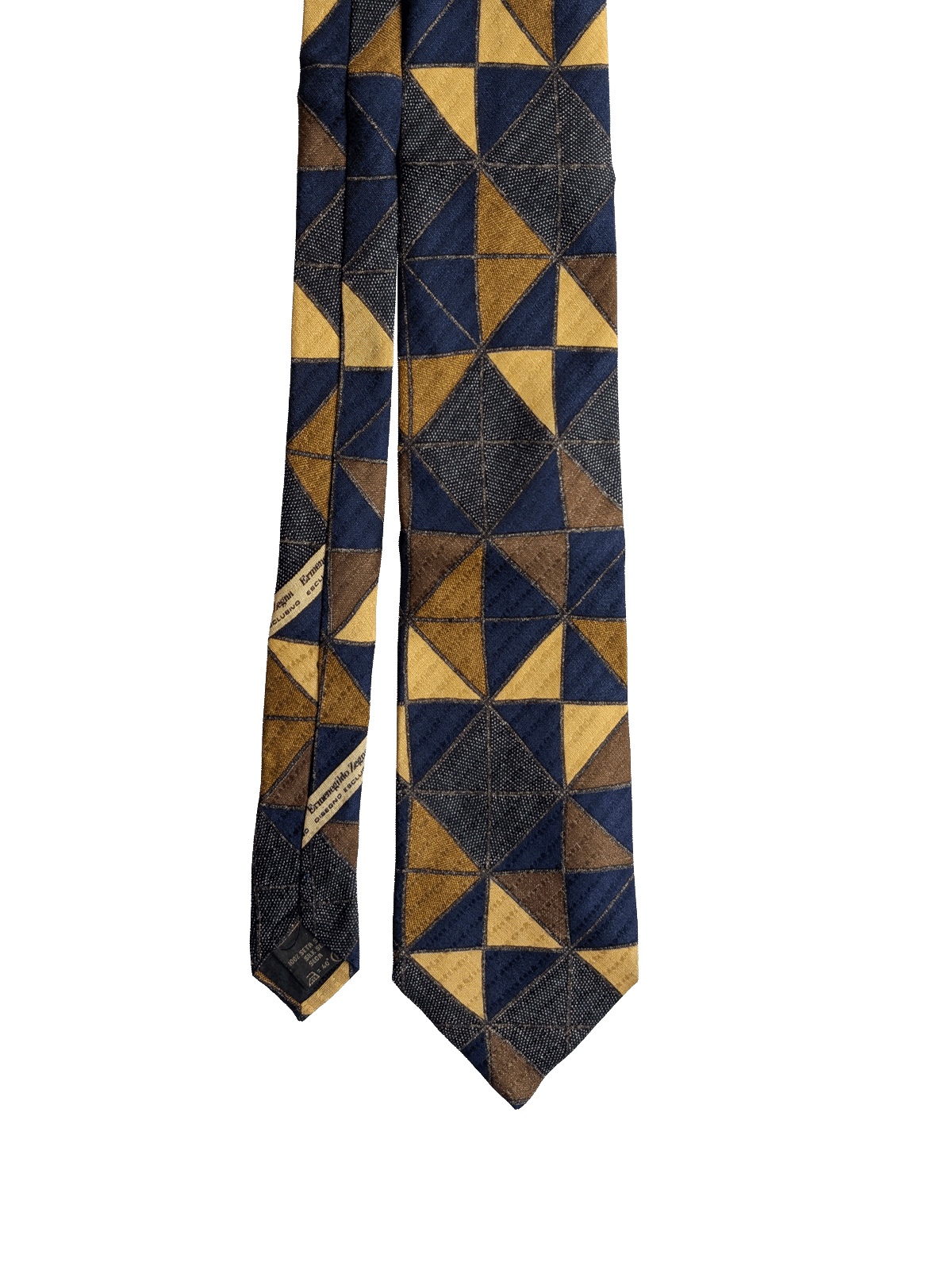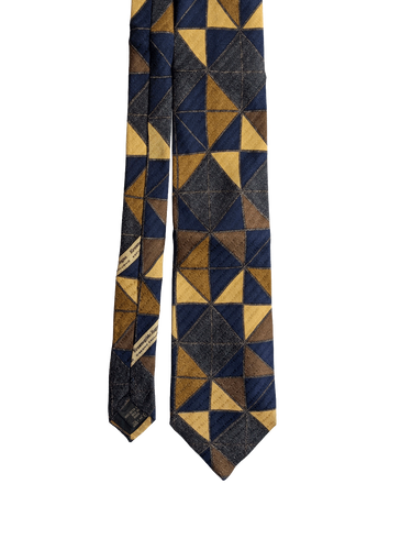 A designer tie with the quality you would expect from Ermenegildo Zegna label. Featuring an eye catching geometric repeat design of interlocking triangles creating a striking abstract pattern, in deep navy blue, yellow, and brown. A classic tie to coordinate with midcentury clothing.