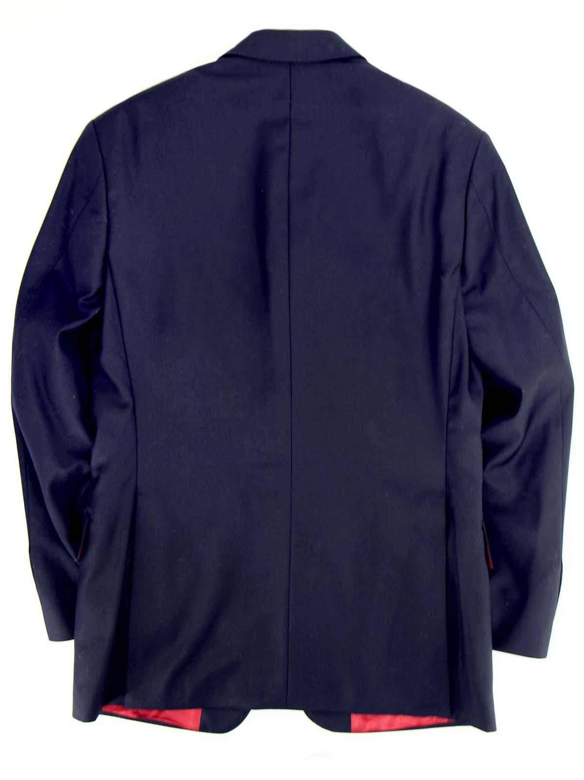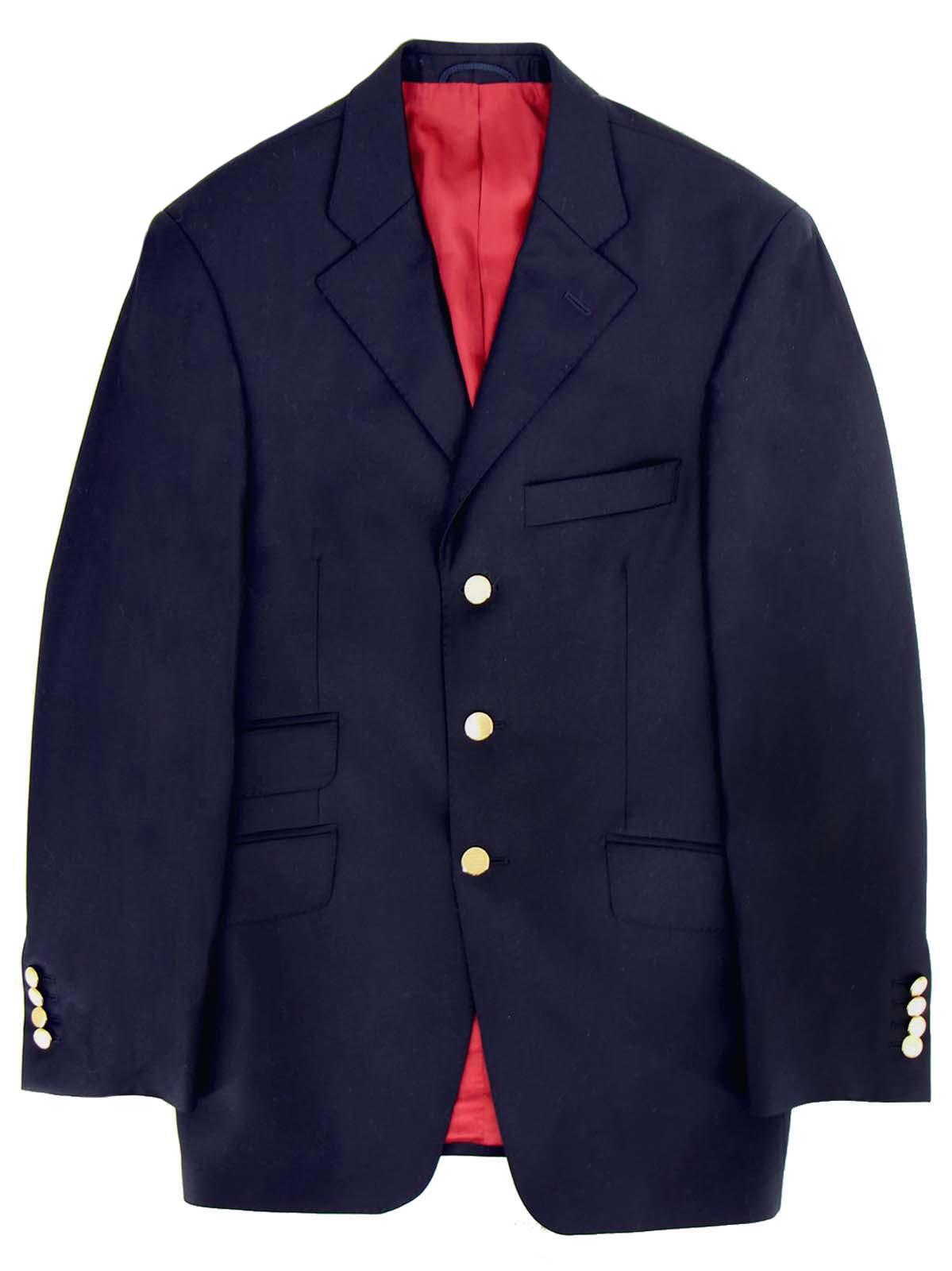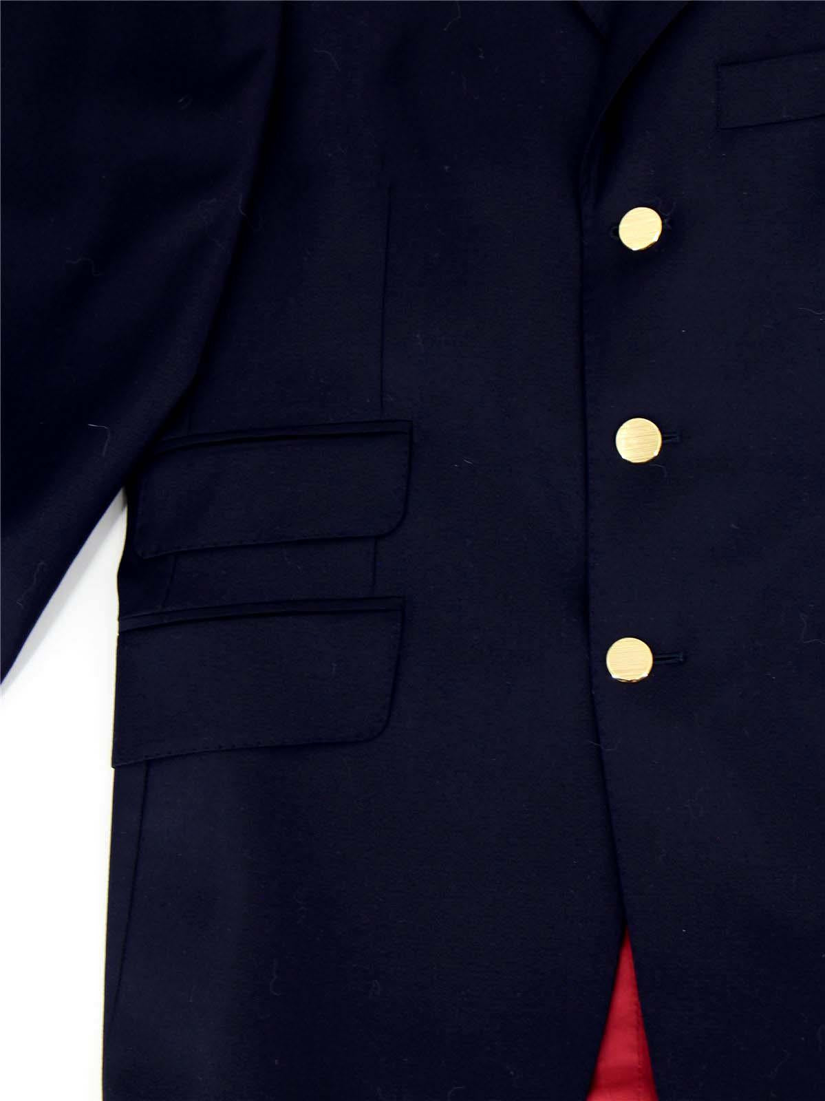 Three gold metal buttons to fasten the jacket, and four additional matching buttons at each cuff. Double back vents and fully lined inside.