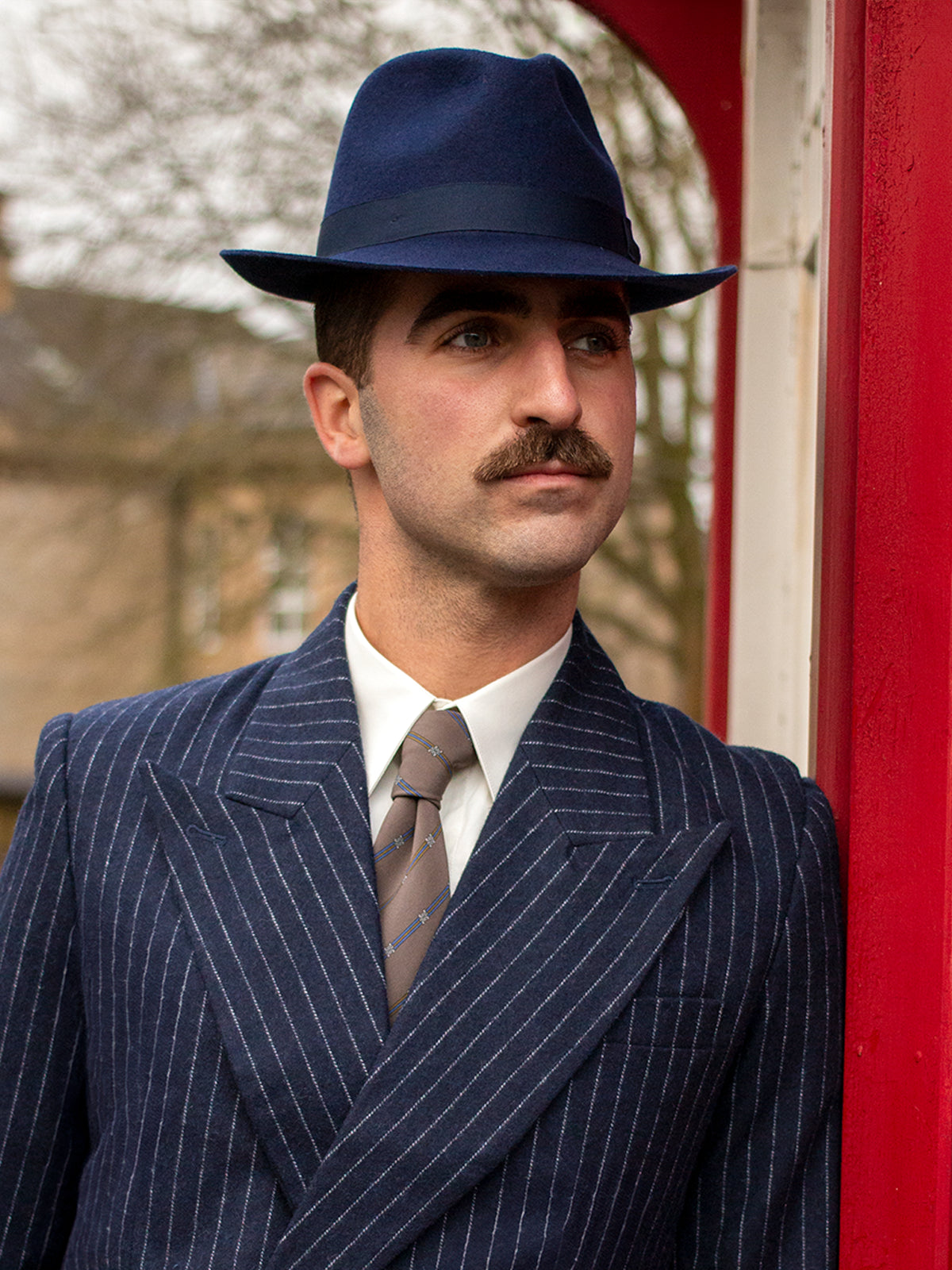 No 40s or 50s ensemble is complete without a dashing vintage style fedora. This retro navy hat is crafted from 100% wool and features a wide brim, a deep grosgrain hatband, and a ribbon tail to one side. The tall crown provides both comfort and an authentic vintage silhouette, making it the perfect finishing touch for midcentury inspired outfits.
