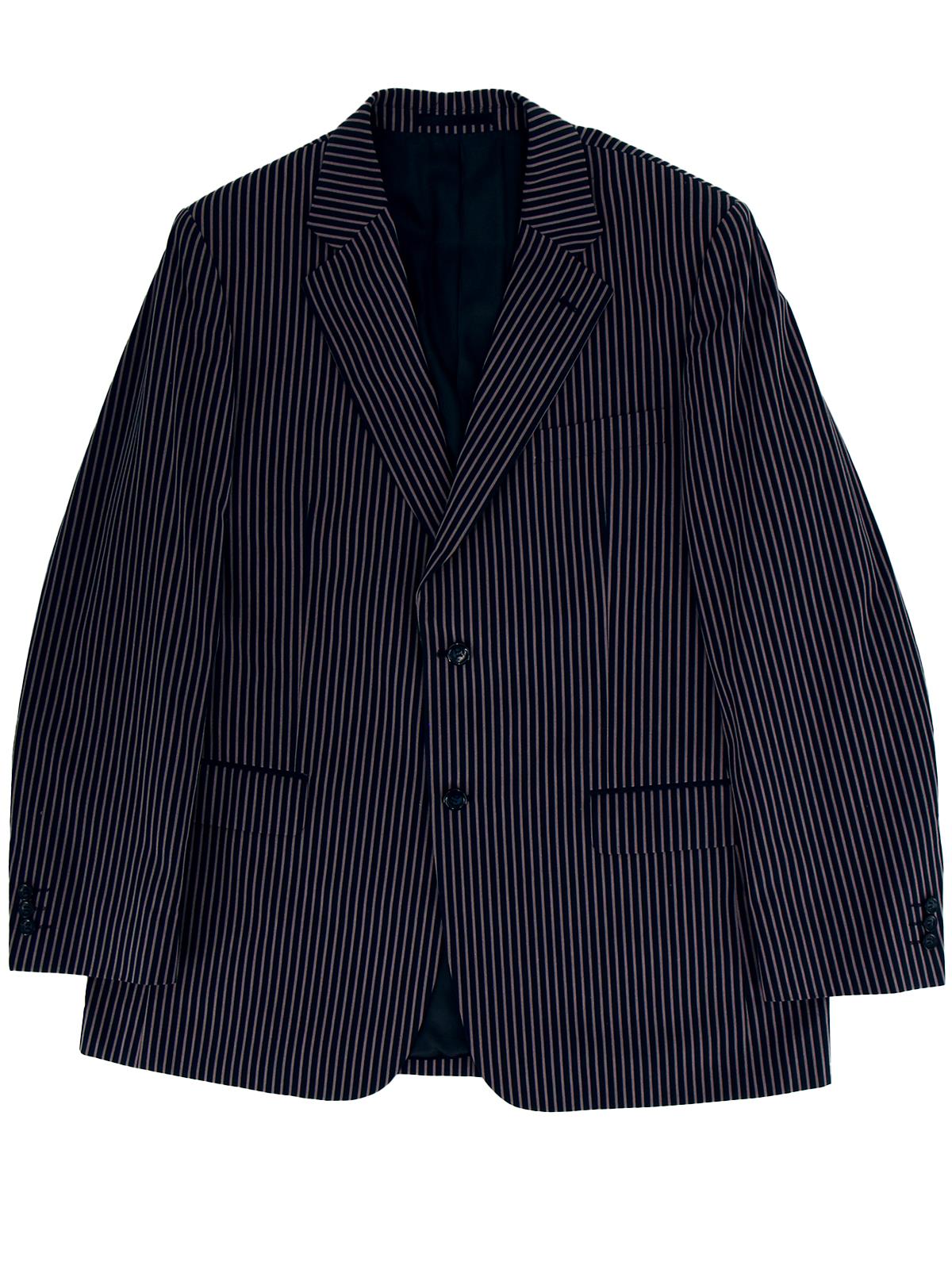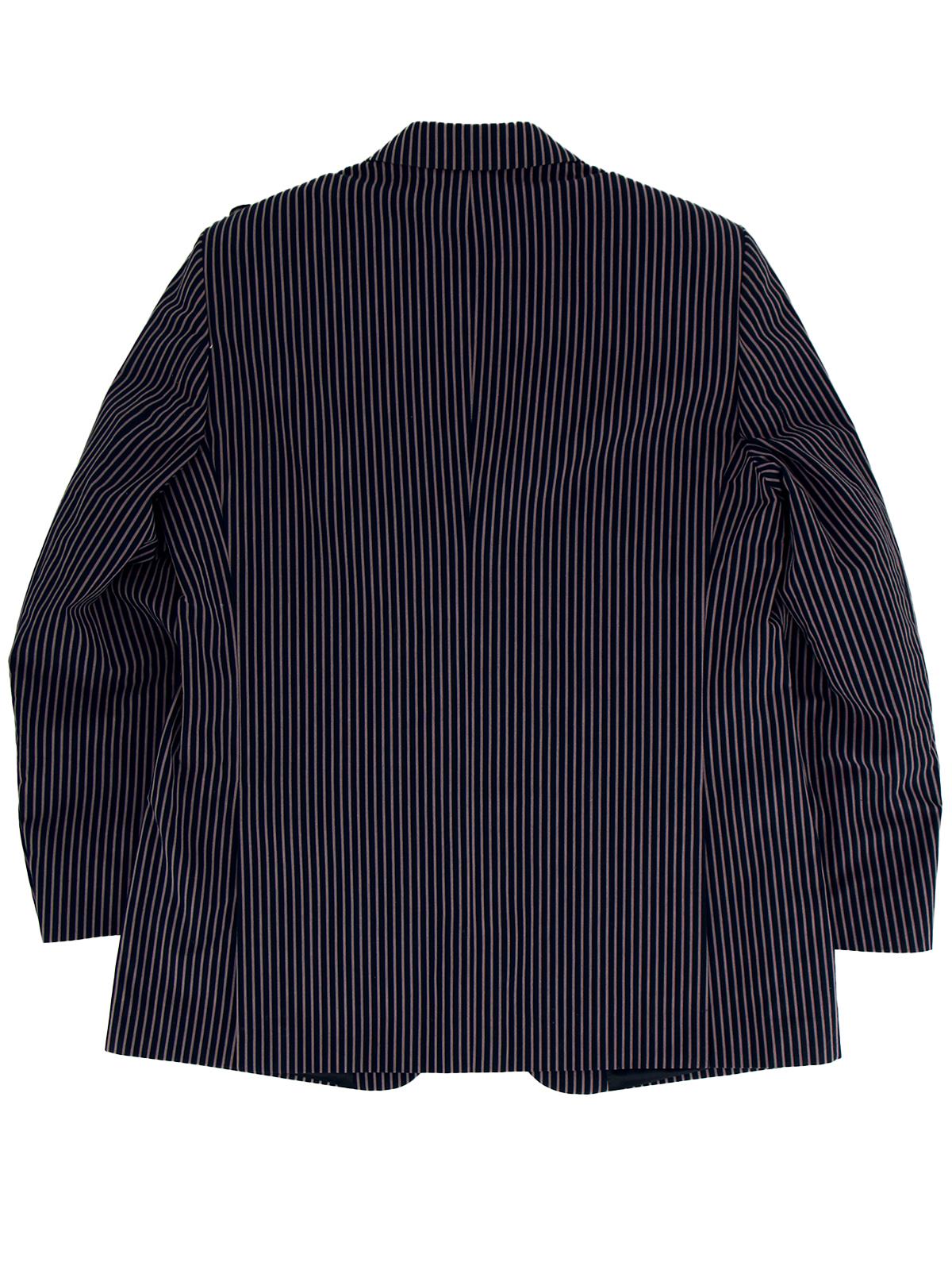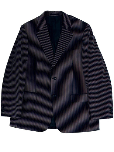 A single-breasted navy blue vintage blazer with a striking grey stripe pattern, from Brook Taverner. A casual and yet charming sartorial choice.