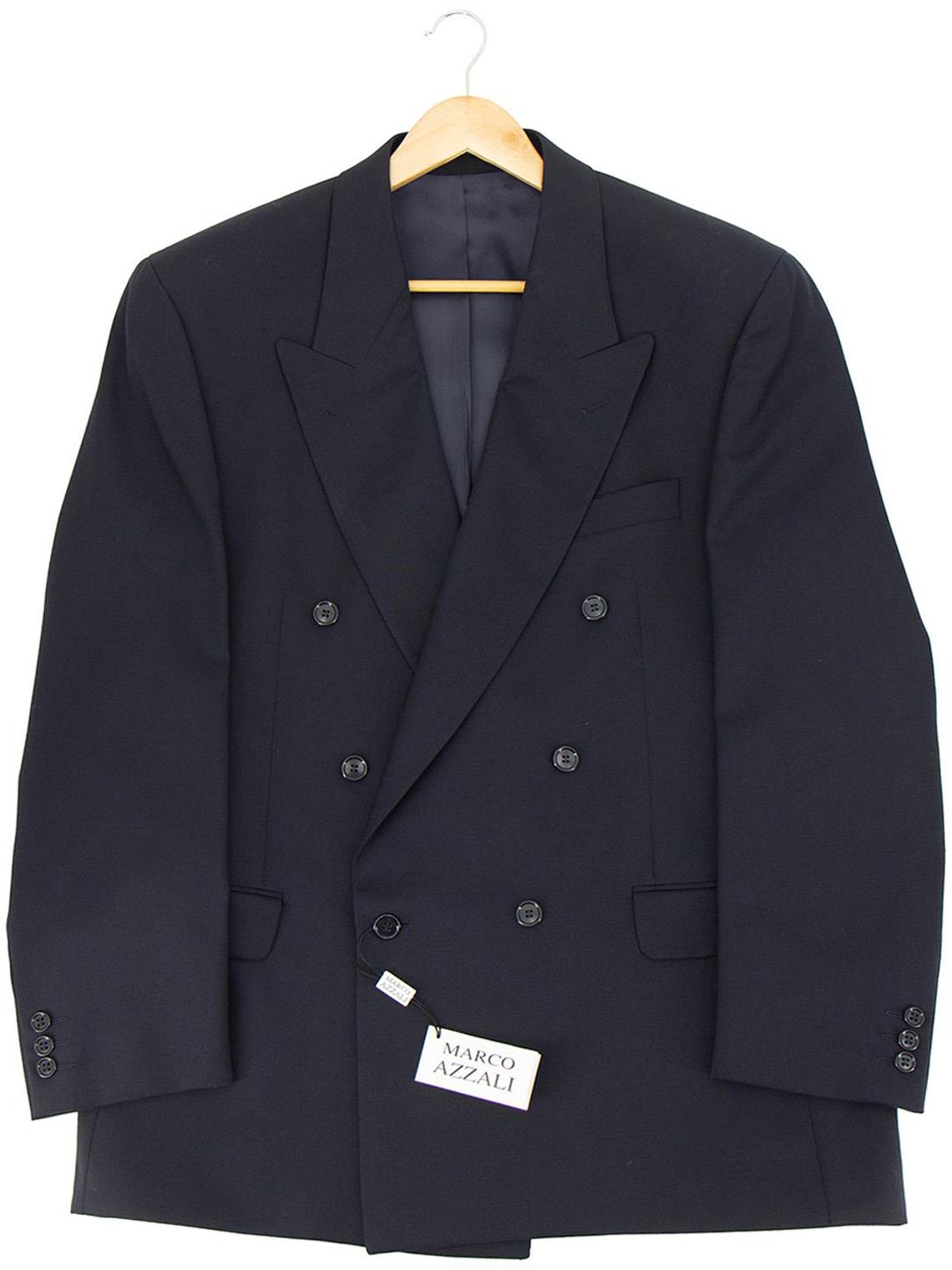A wonderful quality, lightweight, pure new wool, demob style suit. This suit is unworn deadstock in the 1940s demob style, with wide lapels, a double-breasted jacket, buttons to cuffs & lined in a matching navy blue with a total of four interior pockets!