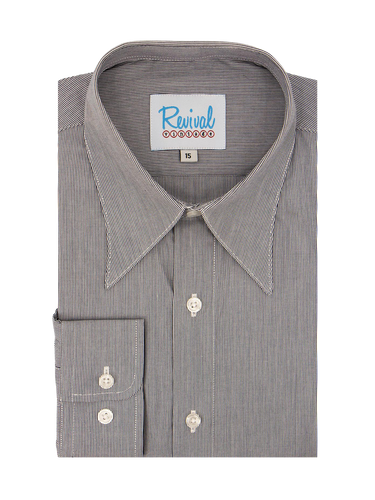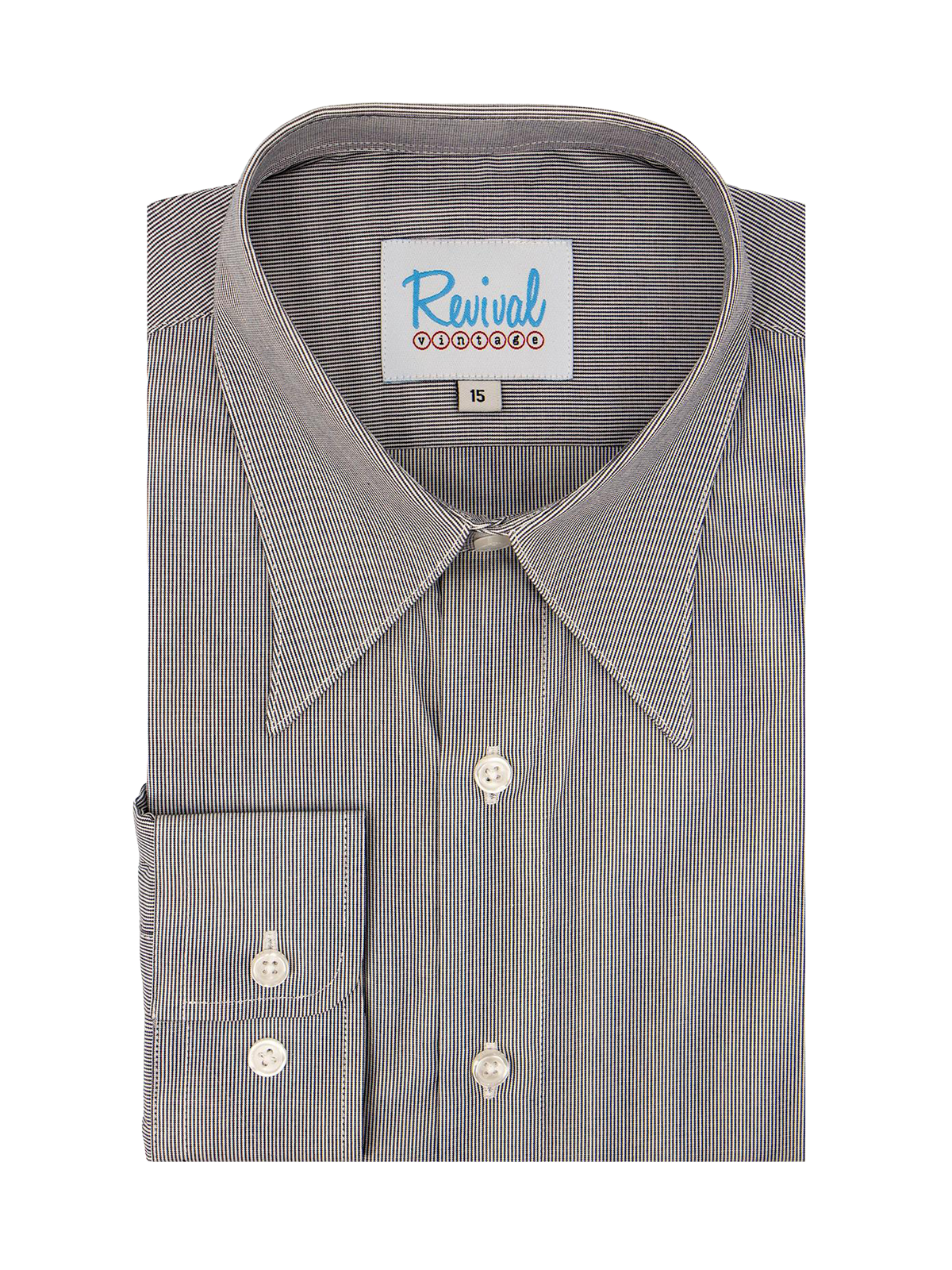 1940s vintage style pure cotton shirt, with a fine navy stripe. A classic midcentury shirt style with a soft spearpoint collar.