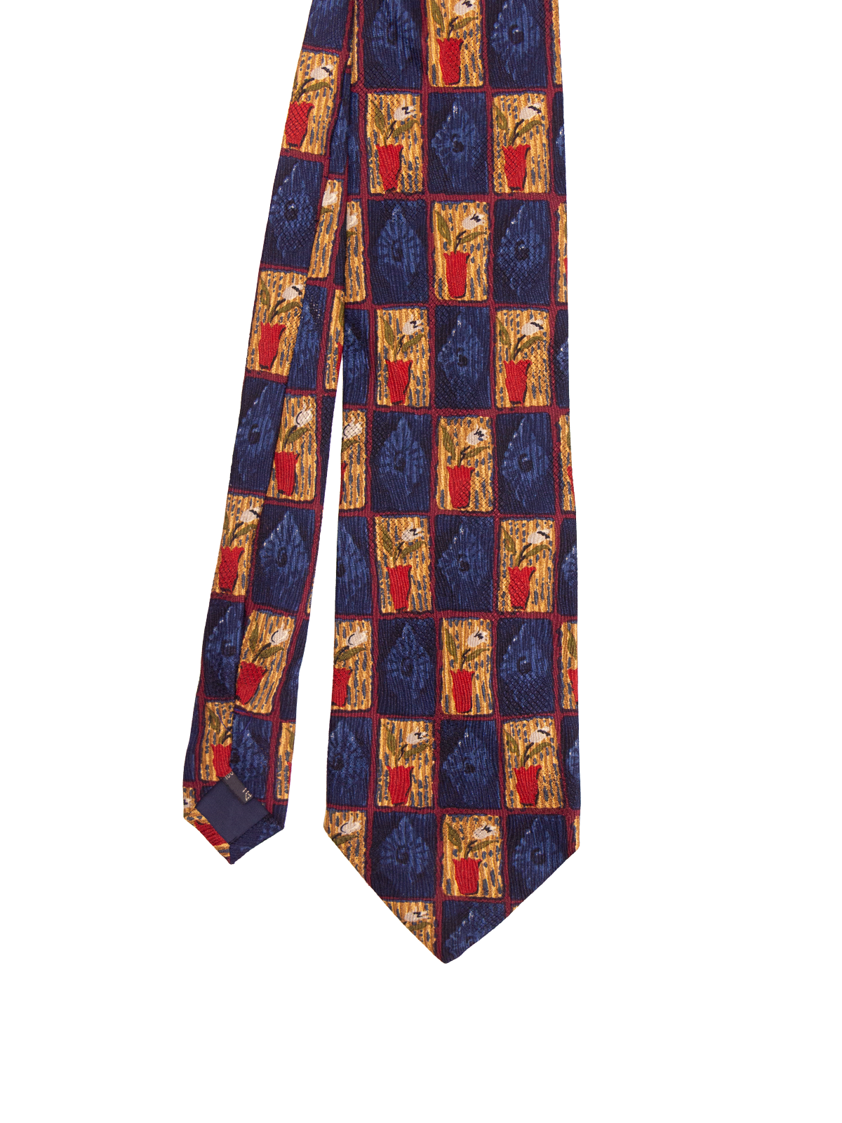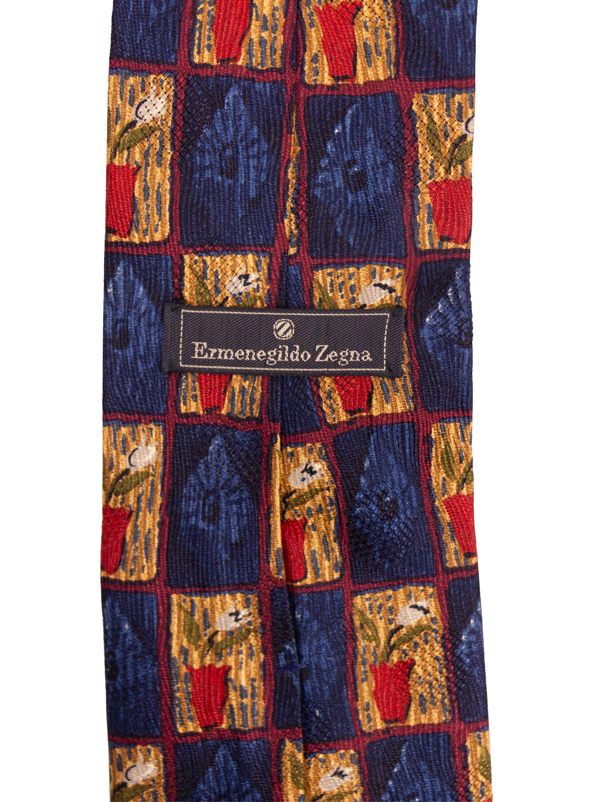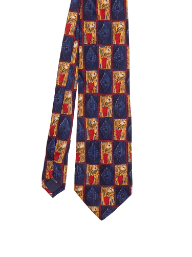 True vintage silk tie by Ermenegildo Zegna. Features a unique patch style design with alternating blocks of floral motifs and abstract textures. Finished in a rich, earthy palette of red, green, and gold on a navy background. A highly characterful piece that offers a bold vintage presence.