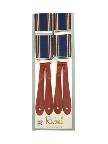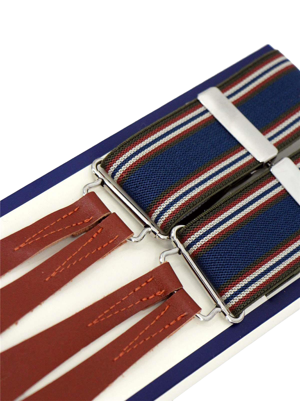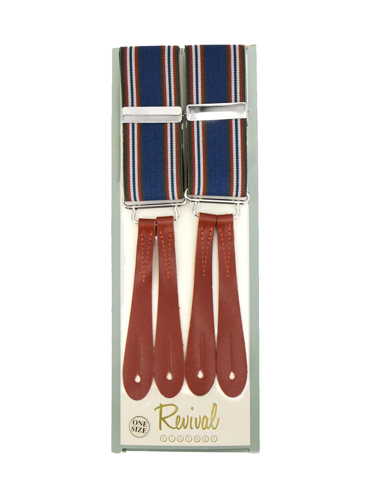 Brown, blue, white and orange stripe with tan leather loops to attach to trousers with waist buttons.