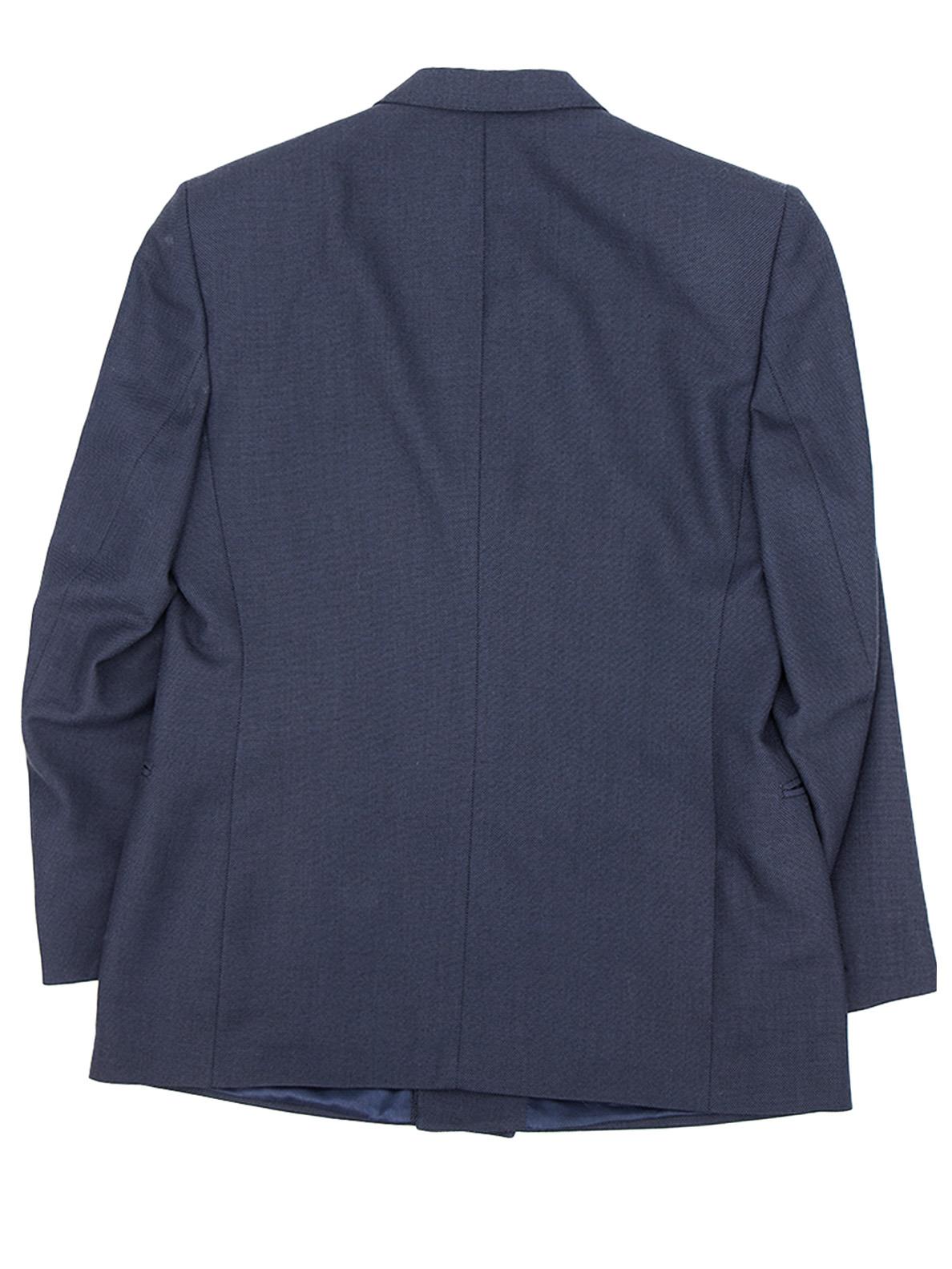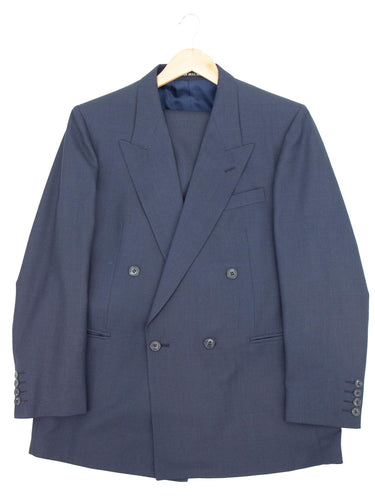 The suit jacket features a double-breasted front with two buttons showing, and a notch lapel. Four buttons at each cuff and no back vents.
